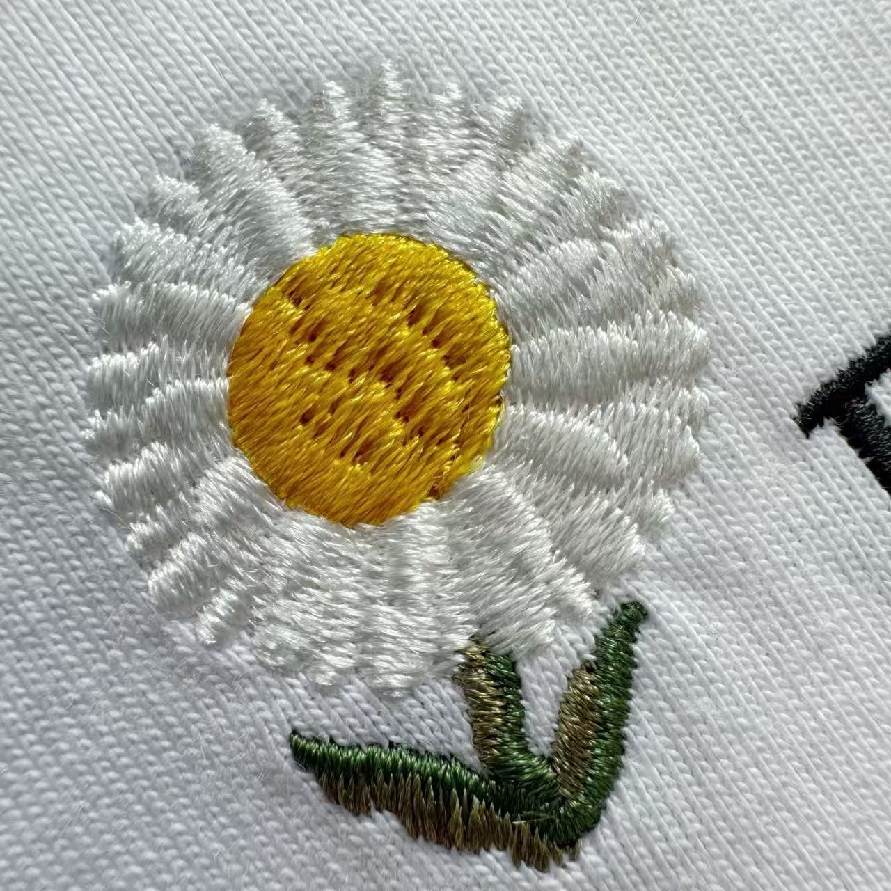 精緻雛菊與標識刺繡: 胸前結合了藝術感十足的雛菊圖騰與品牌標識,營造出浪漫且具備高辨識度的視覺美感。