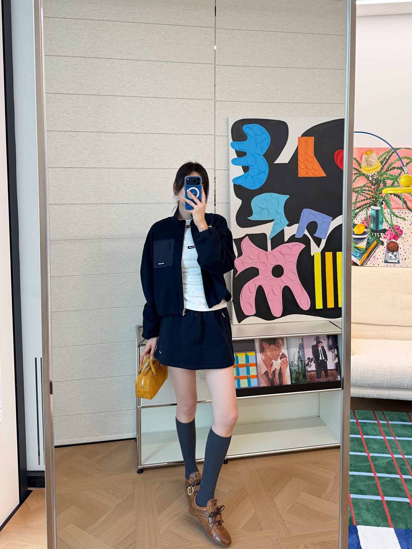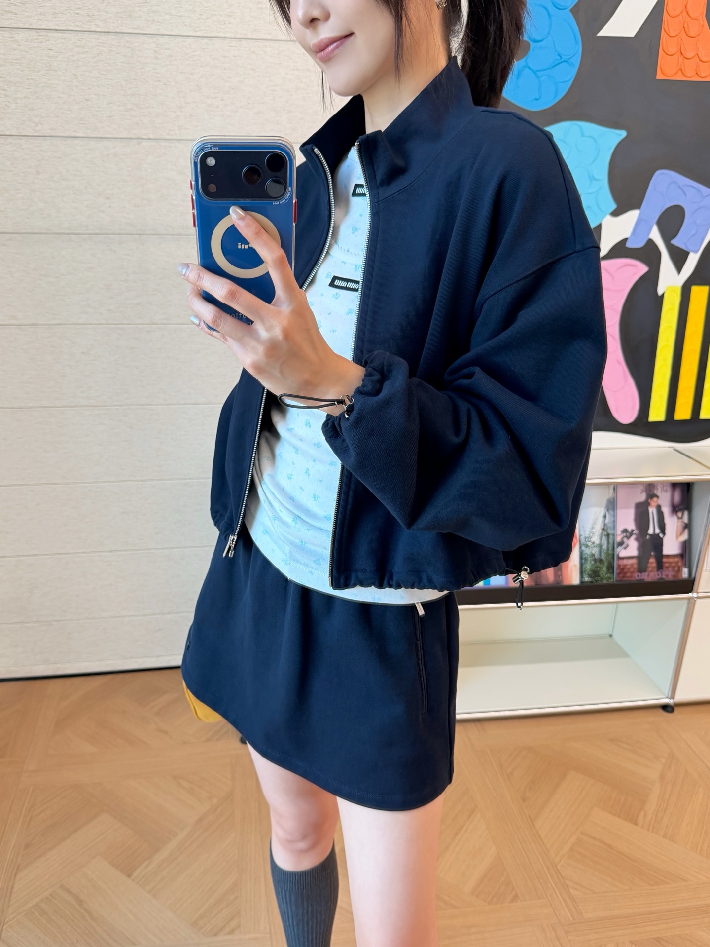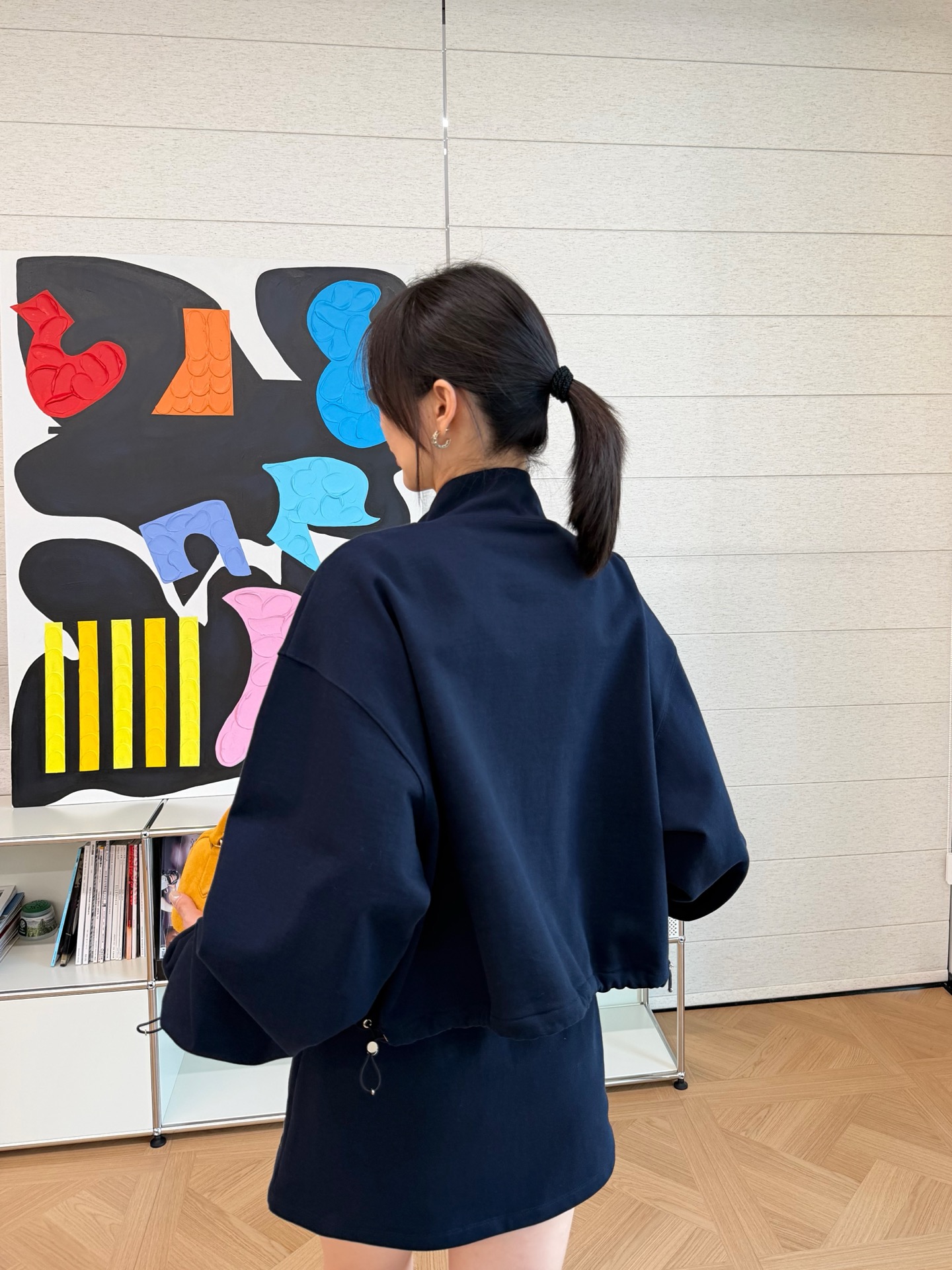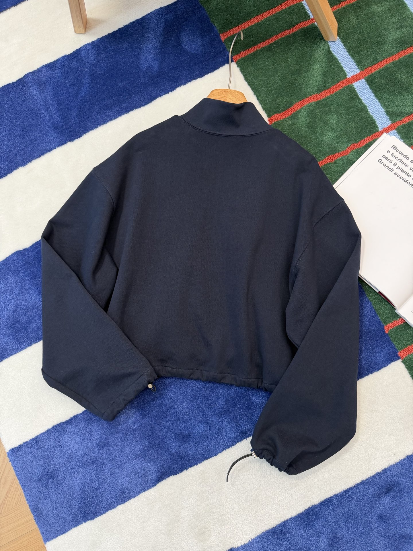 這款一眼就讓人留下深刻印象。低調卻很有存在感的深藍色調,結合短版剪裁與運動元素,穿起來俐落有型,輕鬆詮釋現代休閒風格。