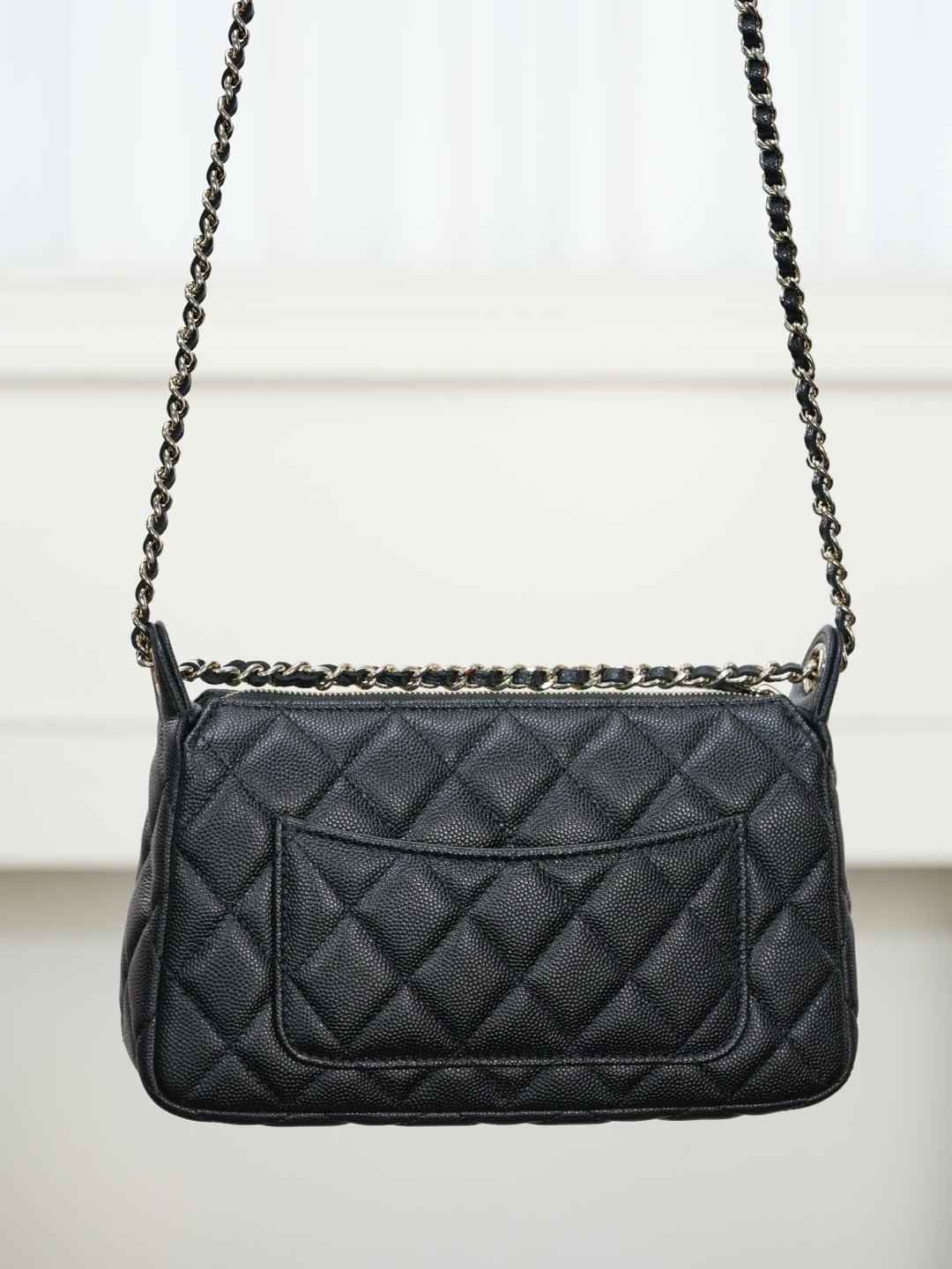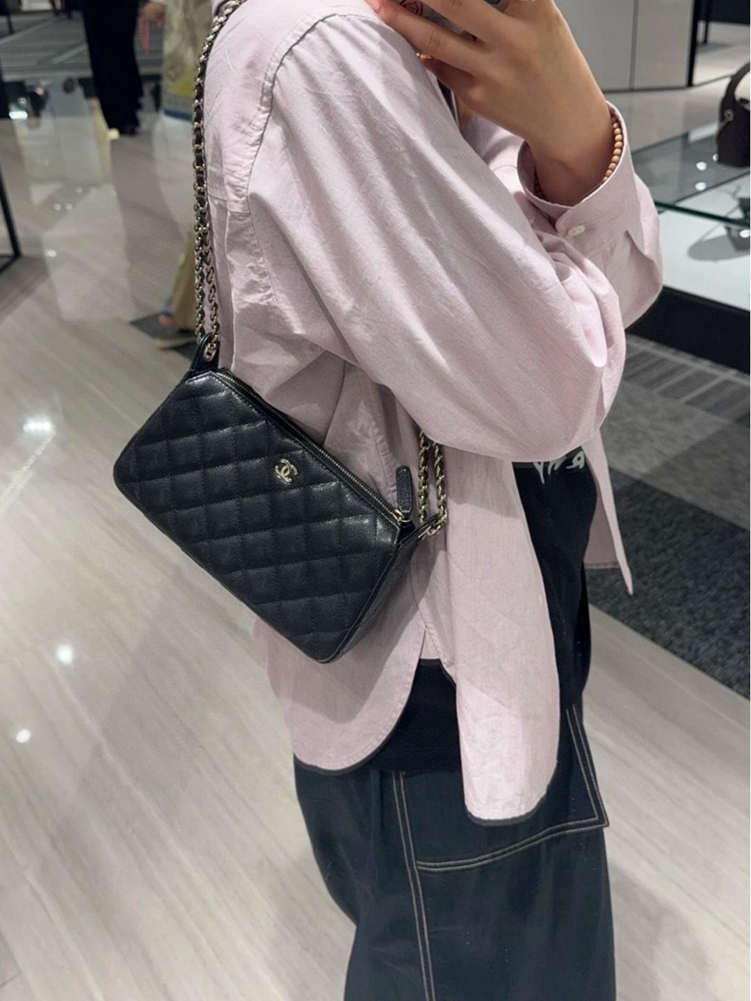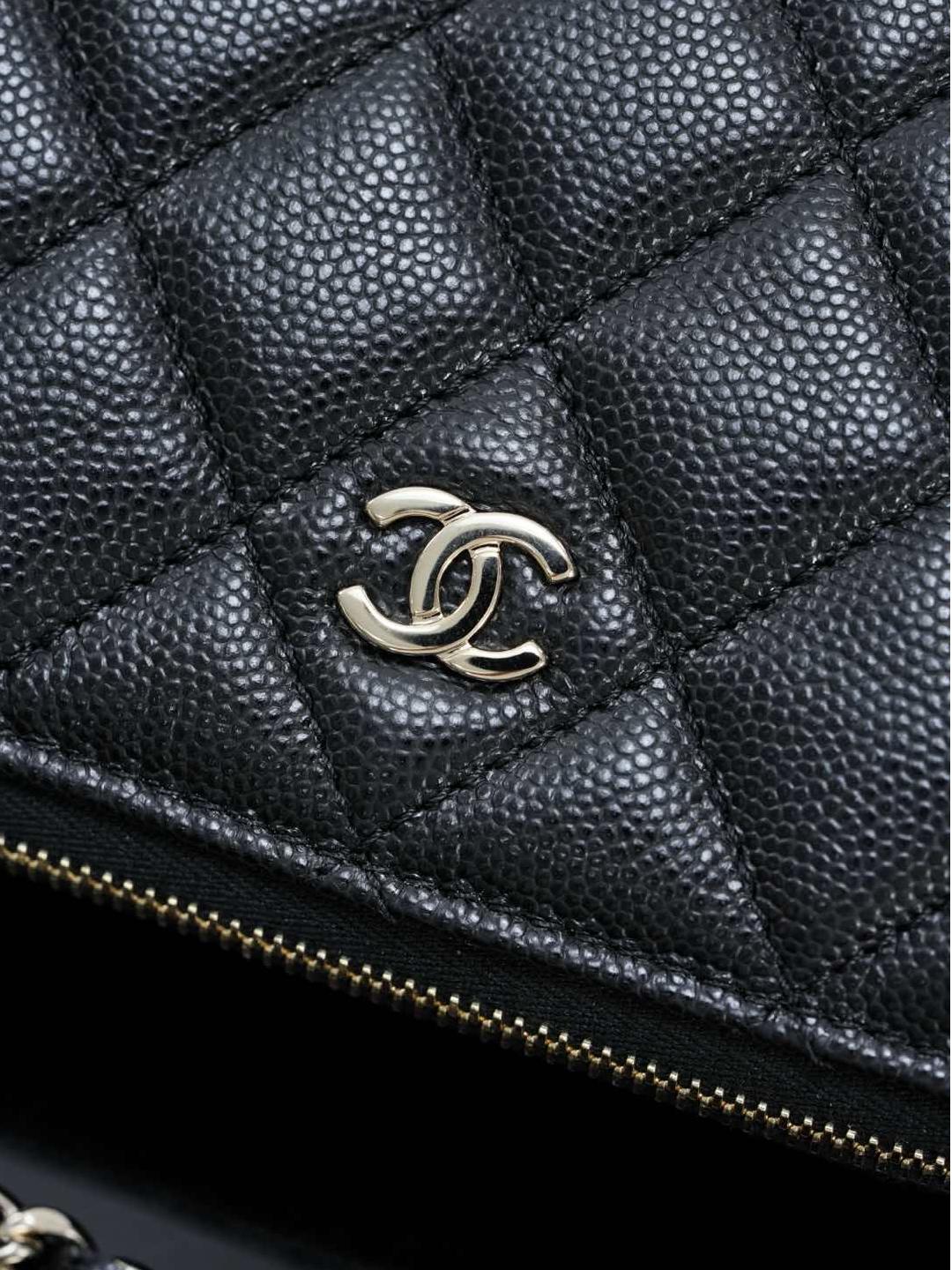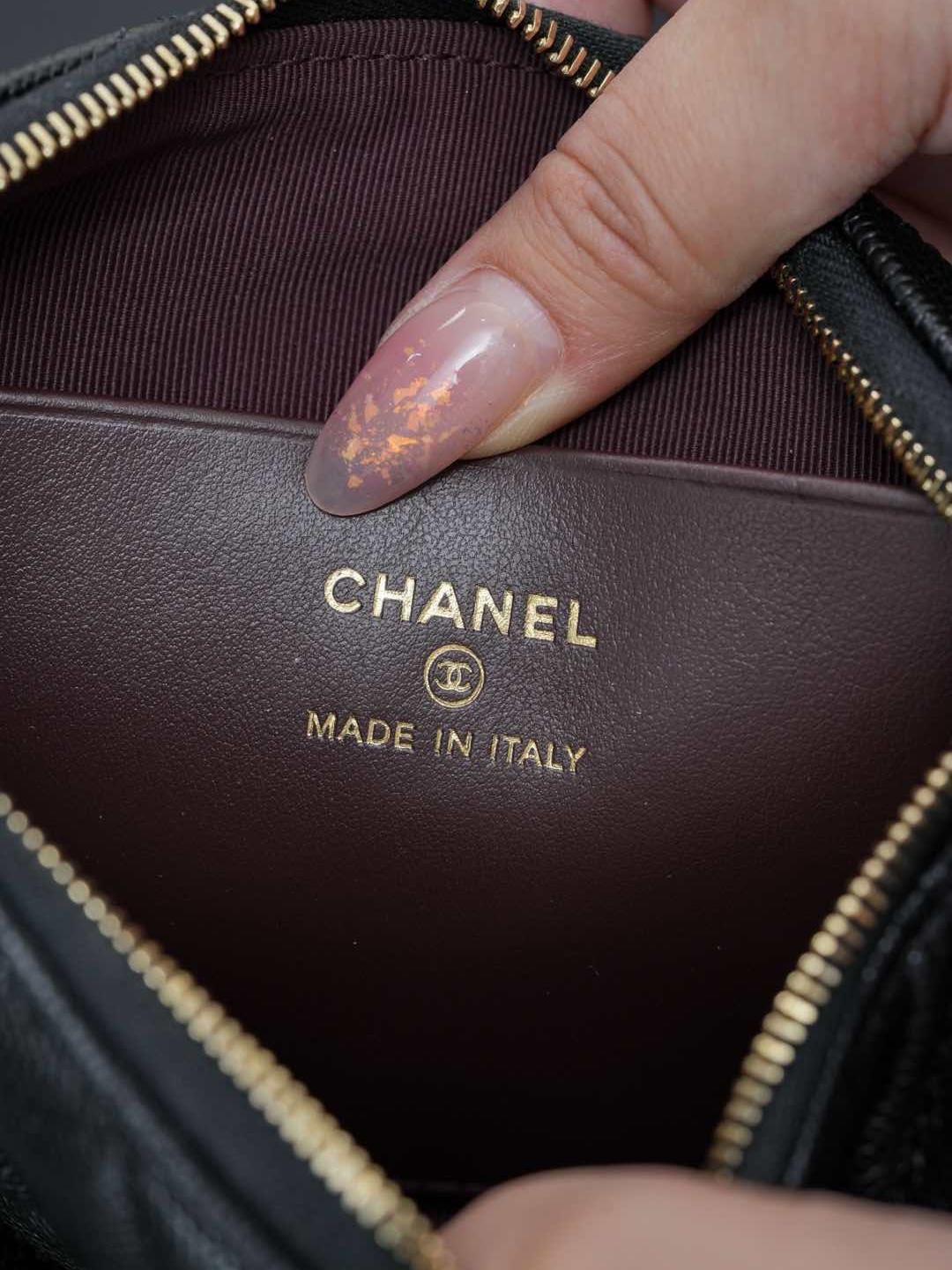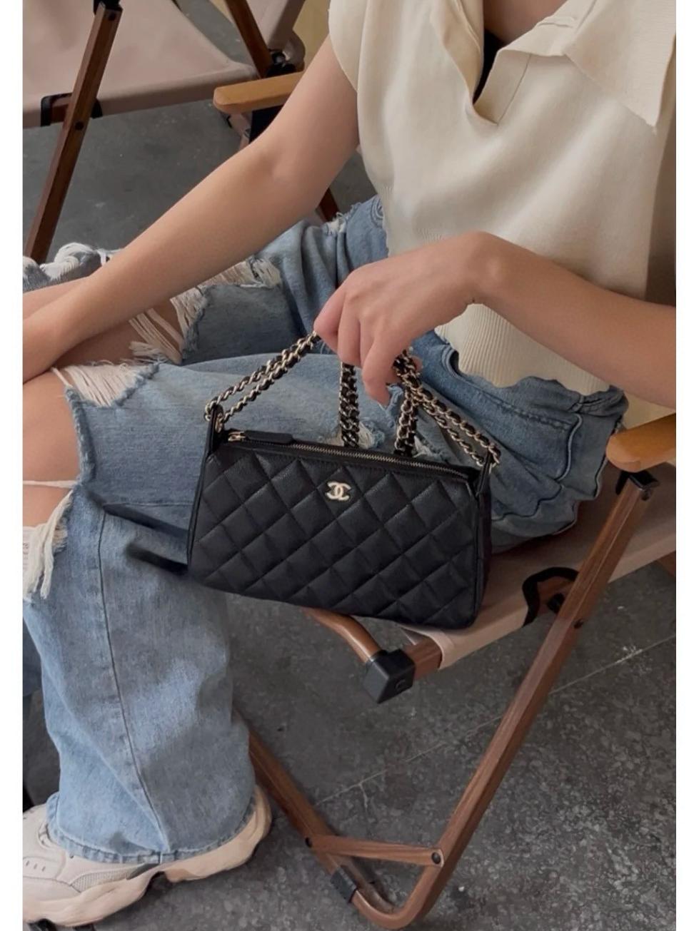 包款搭配純銅製作的香檳金五金件,經過精細打磨處理,鏈條與雙 C 標誌、雞眼配件都帶有光滑鏡面質感,細節處展現出低調卻極致的奢華。拉鍊滑順流暢,開闔之間盡顯細緻工藝。