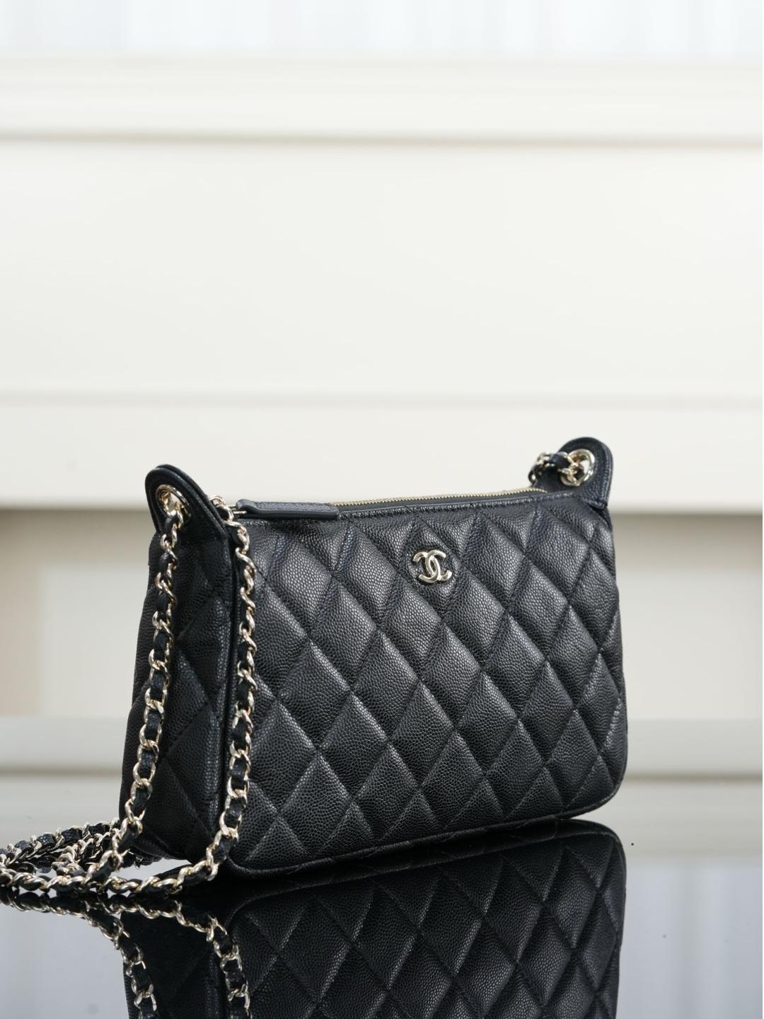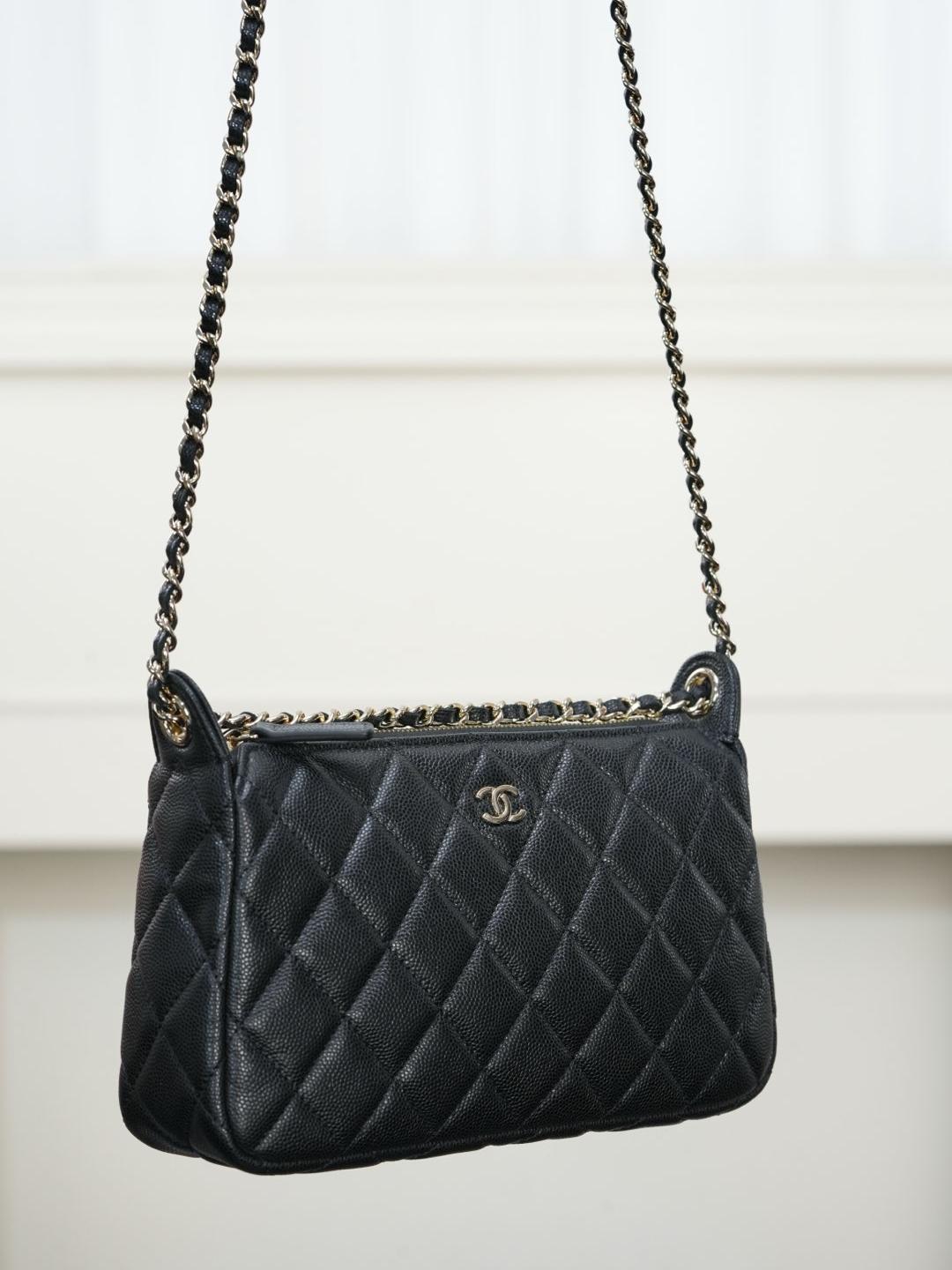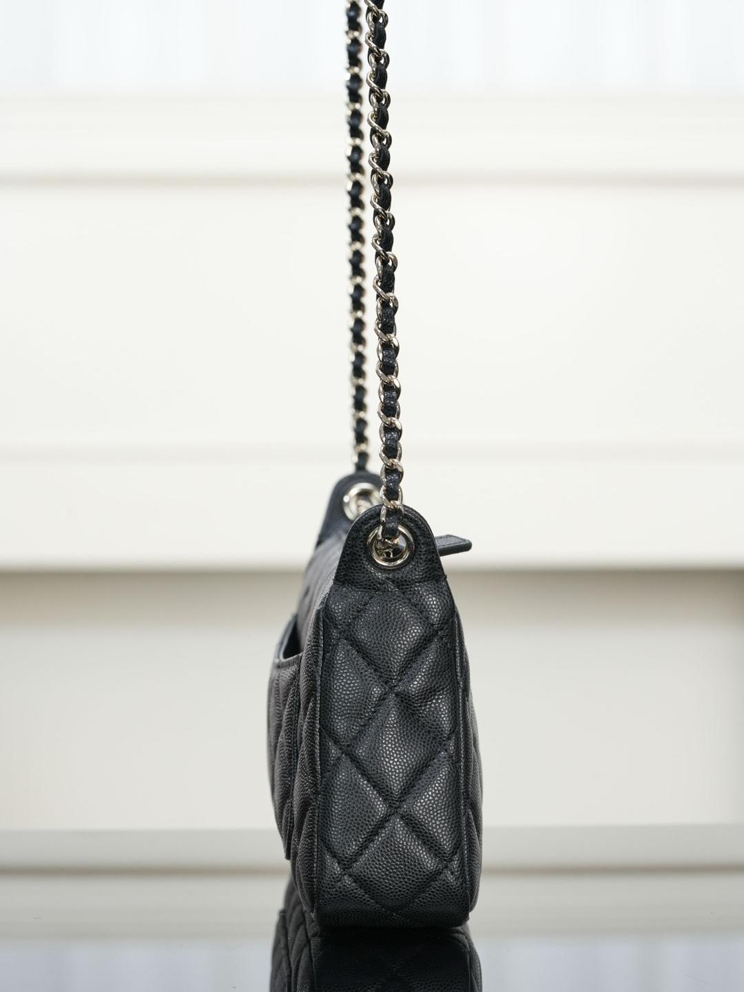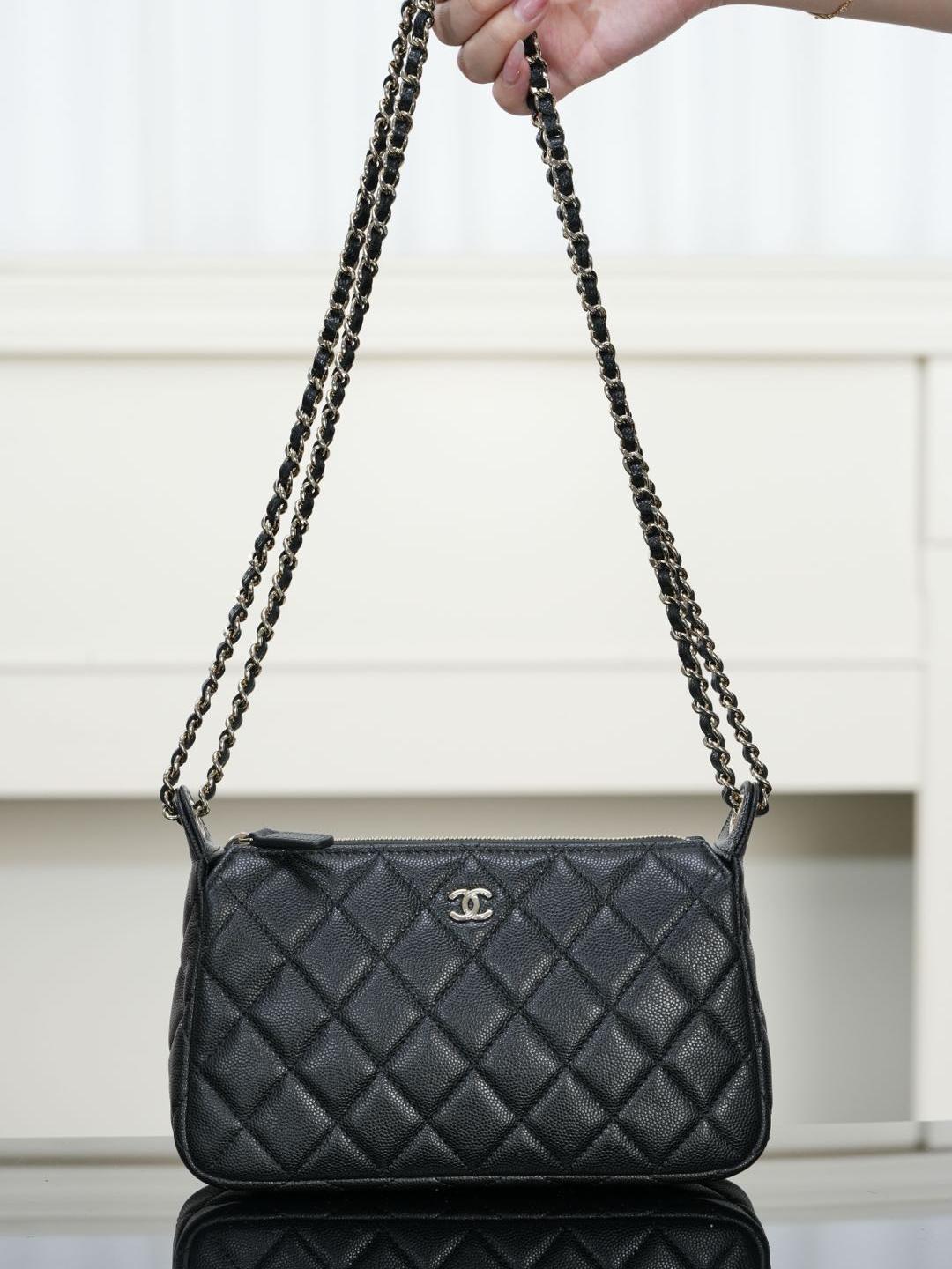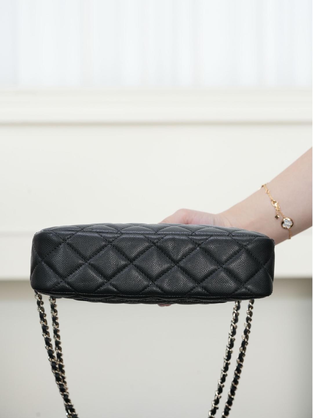 包款搭配純銅製作的香檳金五金件,經過精細打磨處理,鏈條與雙 C 標誌、雞眼配件都帶有光滑鏡面質感,細節處展現出低調卻極致的奢華。拉鍊滑順流暢,開闔之間盡顯細緻工藝。
