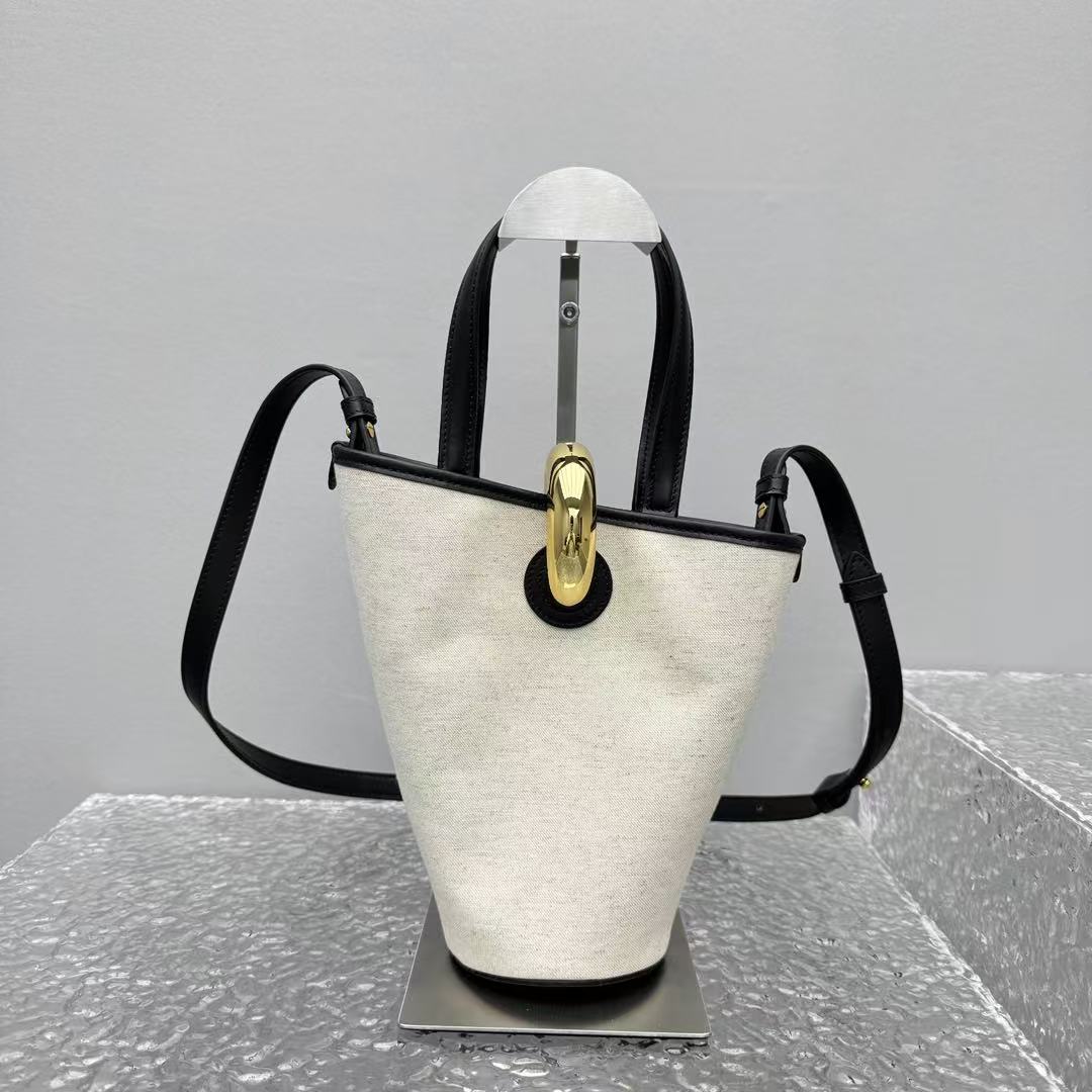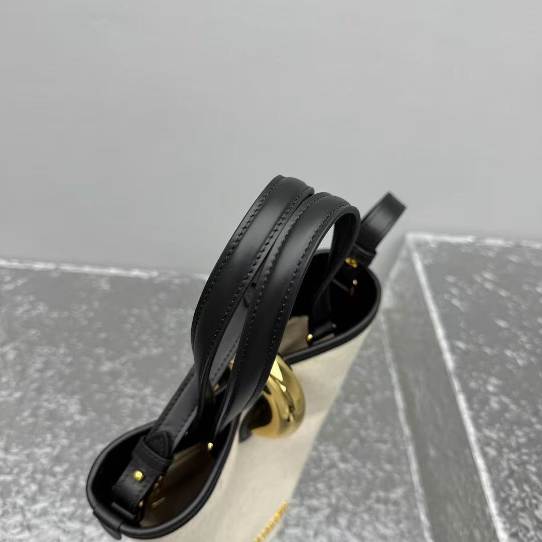 這款Le Petit Bambo手提包以不對稱菜籃子造型顛覆傳統,打破常規的設計感讓人一秒愛上!標誌性大金屬扣飾是全包的吸睛亮點,閃耀的金屬光澤為簡約造型增添一抹奢華氣息,視覺效果直接拉滿!尺寸(底長10cm x 寬10cm x 高20cm)小巧精緻,容量卻足夠日常使用,輕鬆收納手機、錢包和化妝品等隨身物品。帆布拼皮設計打造出簡約而不簡單的質感,無論是手提還是單肩背,都能輕鬆拿捏優雅與隨性的完美平衡。從日常通勤到週末約會,這款包都能為你的造型加分,展現獨特的時尚態度!