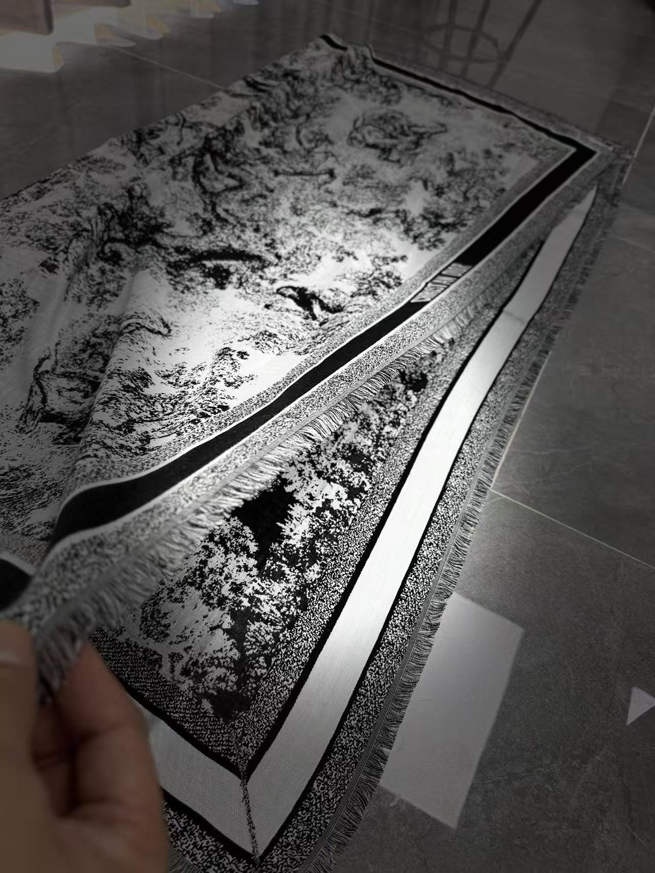 最瘋狂的當然是那「手工剪花+義大利法斯特機器+雙面平紋」!動物圖案不是印花,而是真·緯密470/10cm+一半紗線剪掉的剪花工藝,每條浪費三分之一紗線只為做出原版立體感;織機直接上義大利頂級法斯特,一天一台車才30條,後整還要洗縮+兩次拉幅烘乾,工序變態到工廠老闆都說「這輩子沒見過這麼難的貨」~