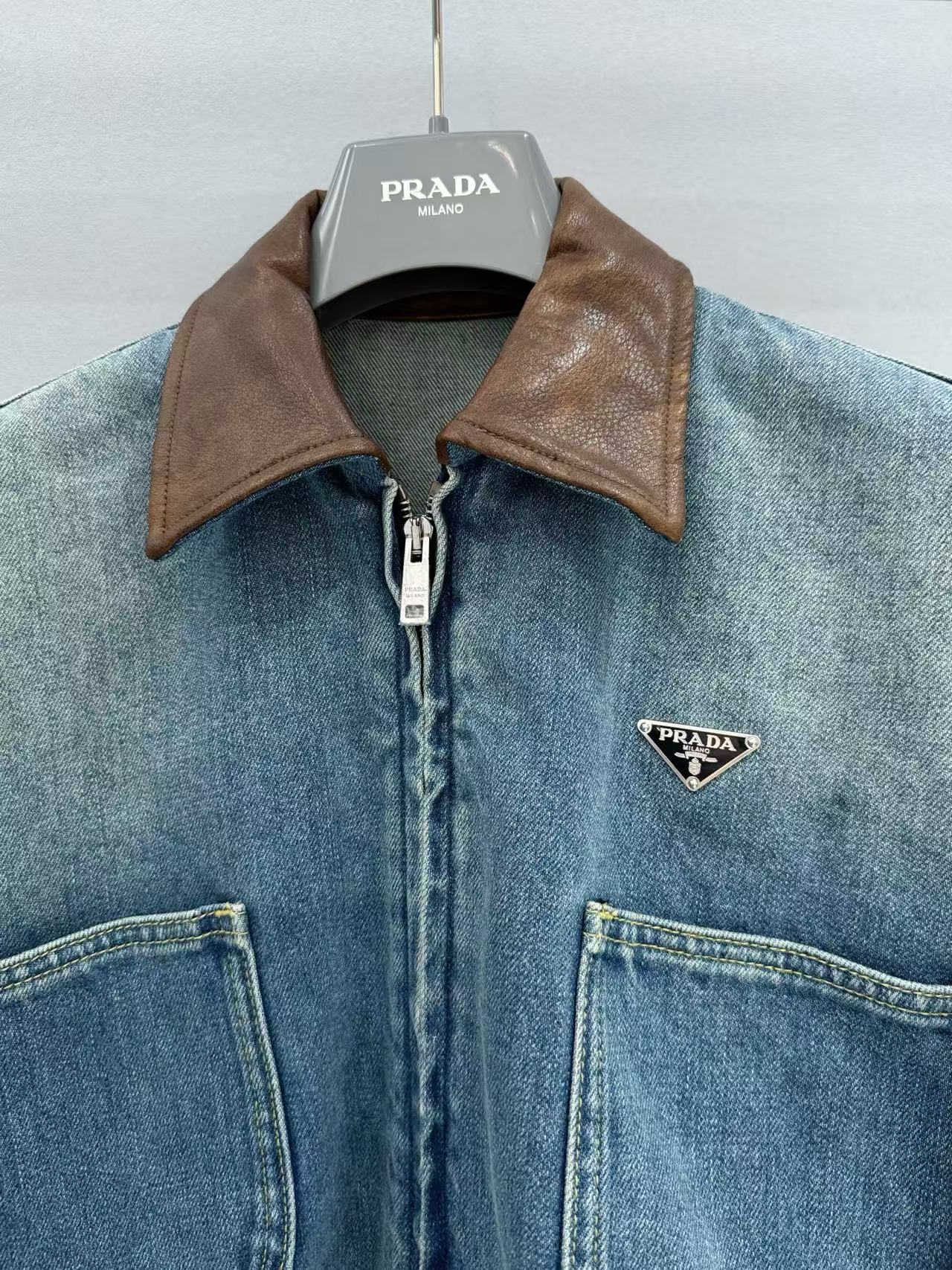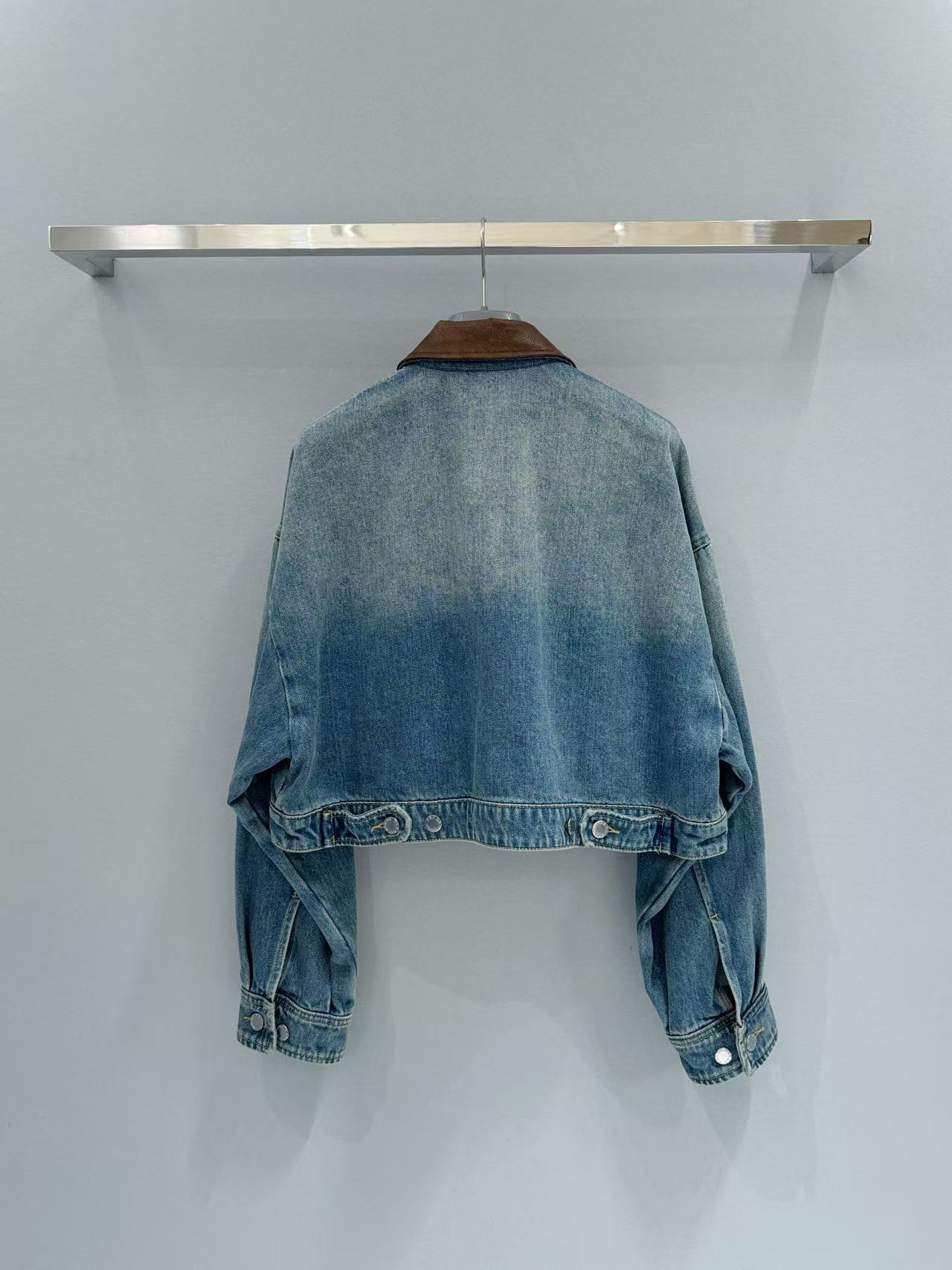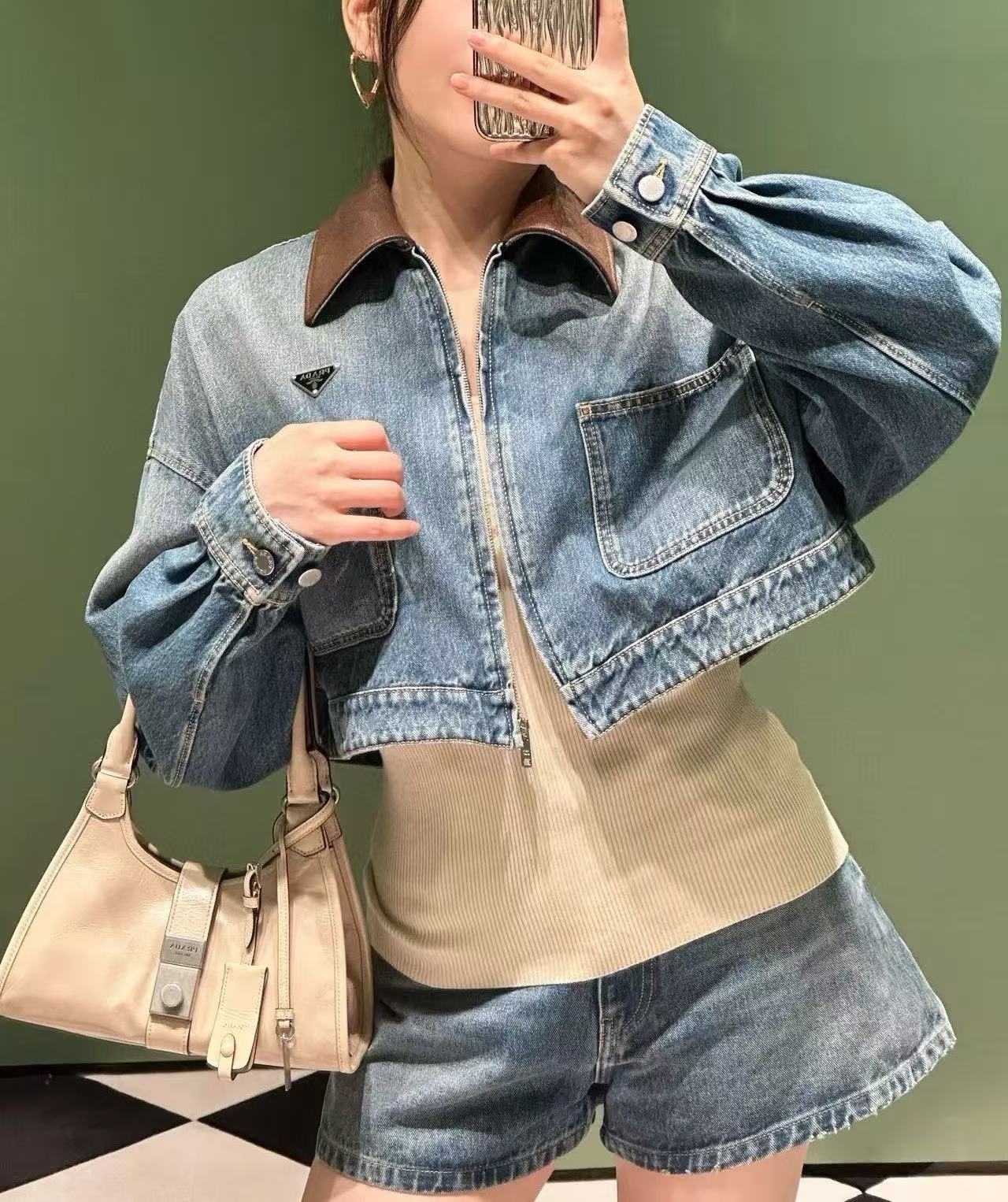 短版版型拉高身形比例,俐落又顯瘦。領口拼接棕色皮革細節,讓整體層次更豐富,也瞬間提升了高級感,搭配深藍水洗牛仔,更突顯品牌的精緻質感。