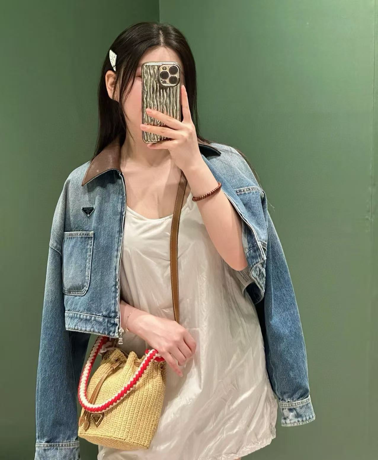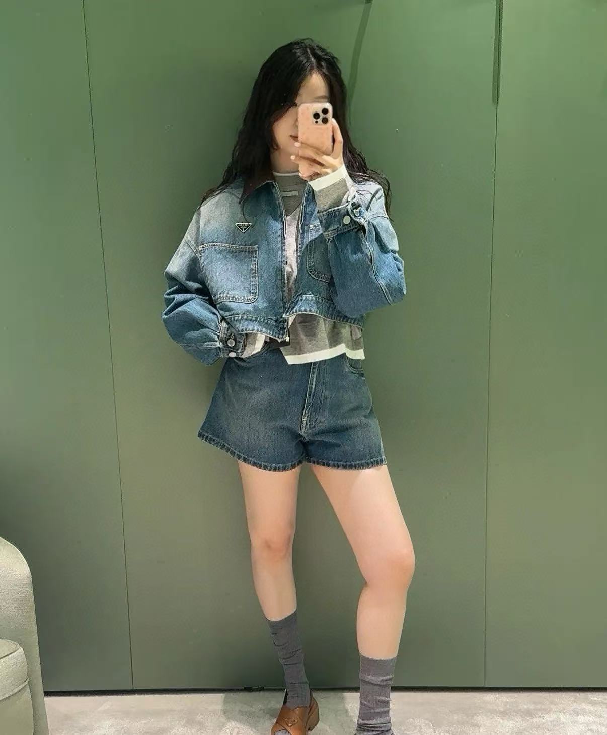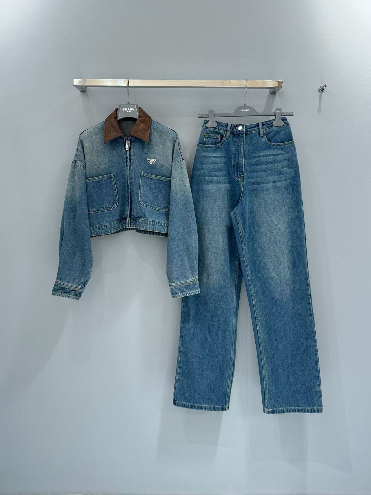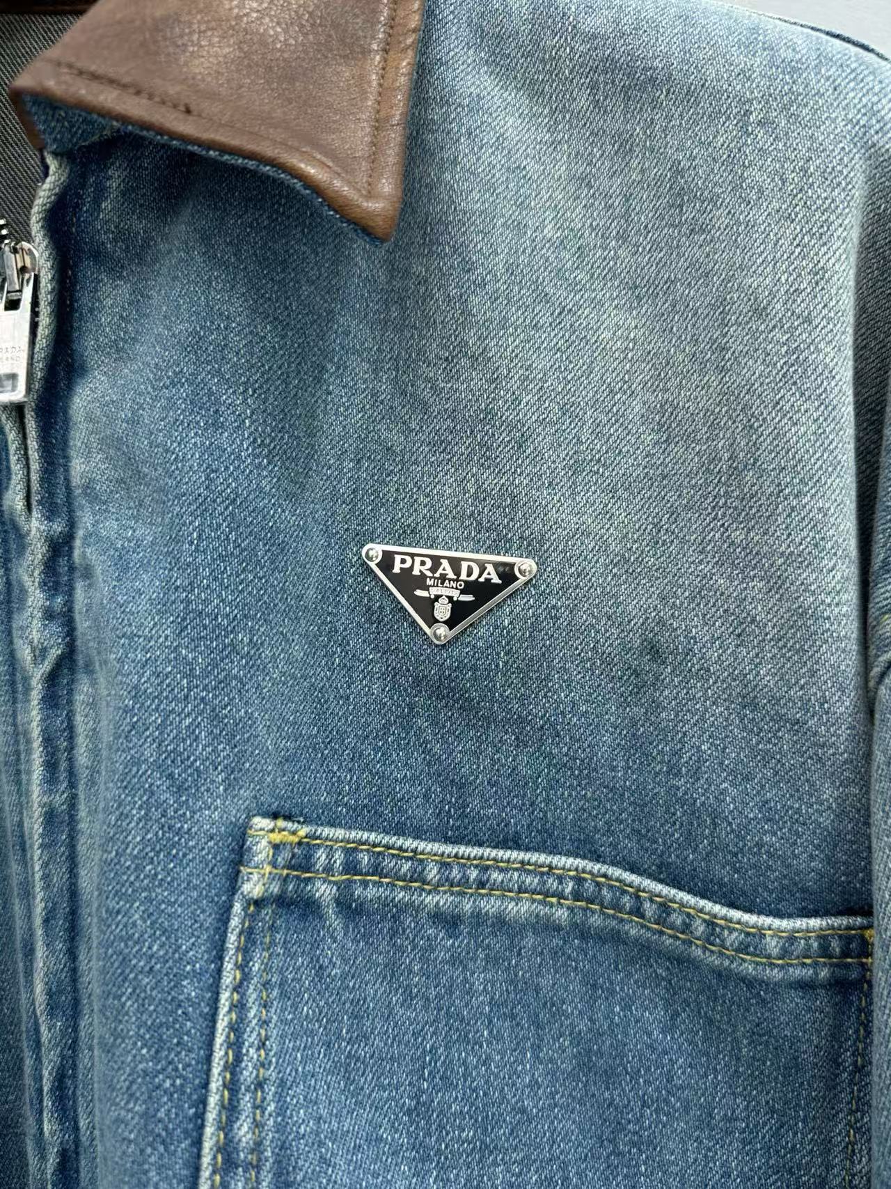 短版版型拉高身形比例,俐落又顯瘦。領口拼接棕色皮革細節,讓整體層次更豐富,也瞬間提升了高級感,搭配深藍水洗牛仔,更突顯品牌的精緻質感。