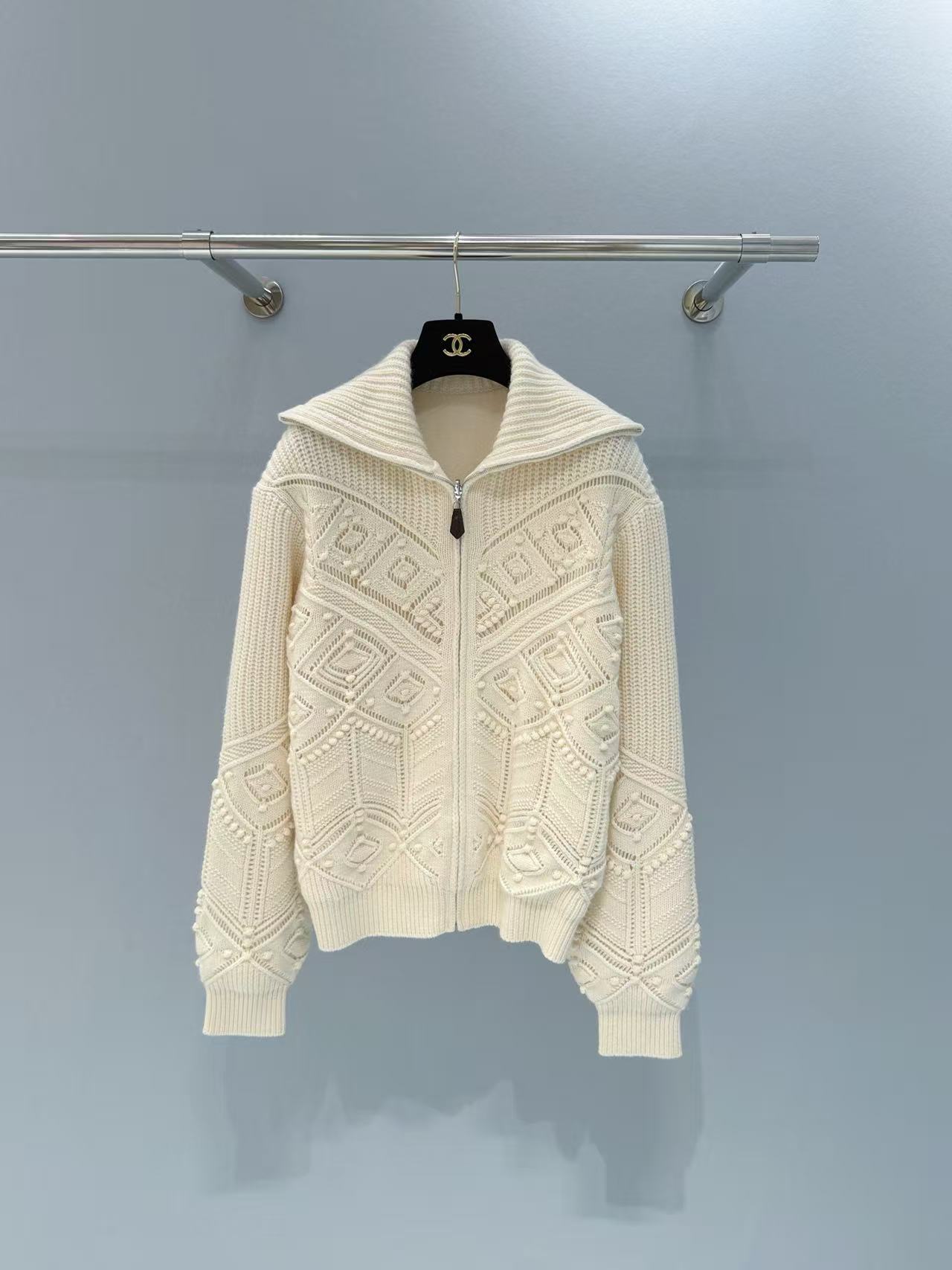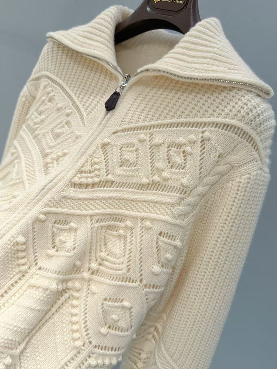 領子可立領擋風保暖,也能翻折成休閒翻領,拉鍊頭的皮質掛墜是品牌經典的低調奢華標誌,針織紋理對稱工整,做工細膩到每一處都挑不出毛病,質感完全藏在看不見的工序裡!