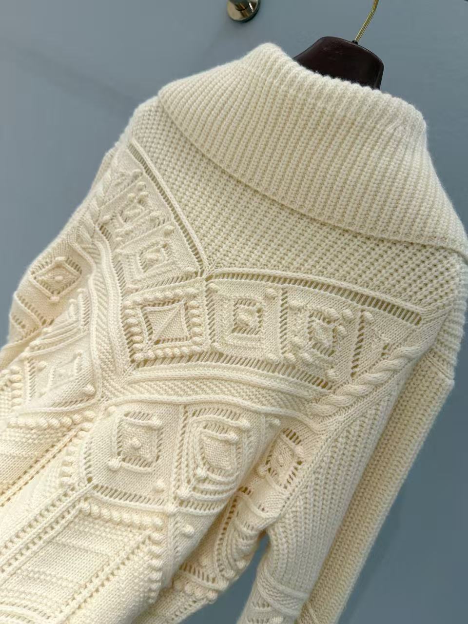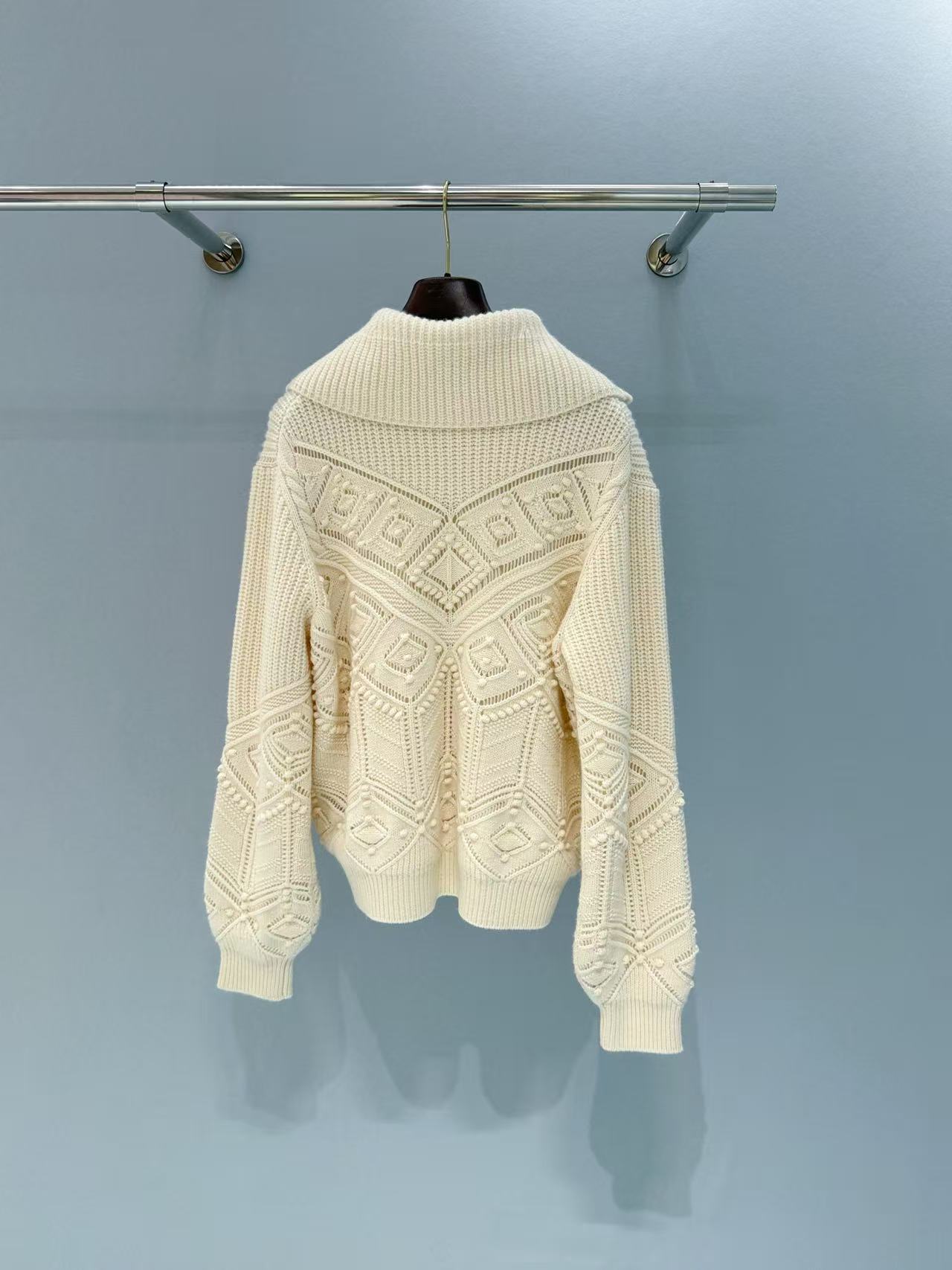 衣身滿版的菱形格紋搭配立體毛球肌理,遠看低調近看超有質感,每一顆毛球都是手工定位,摸得到那種精緻的立體感,比一般針織衫更有辨識度。