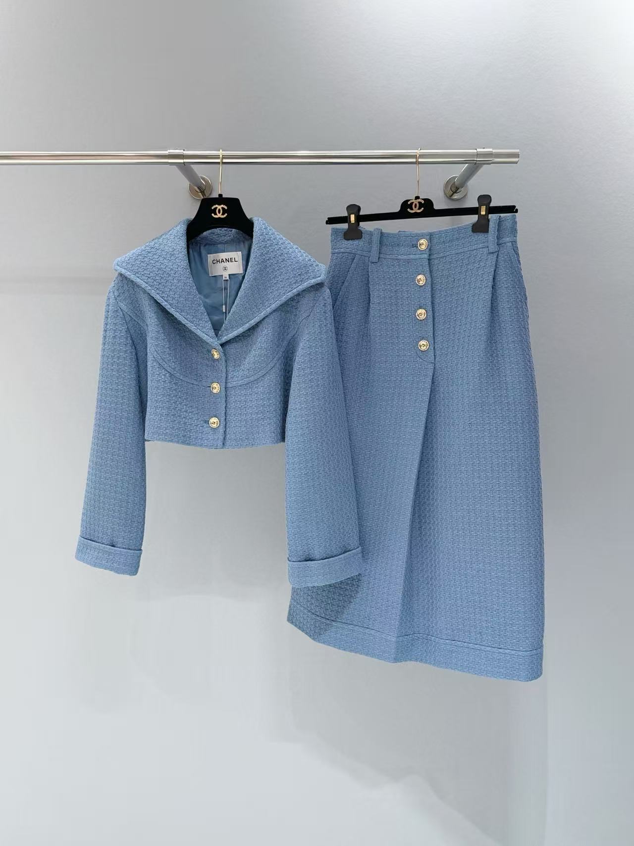 版型: 走秀款立體剪裁,外套為短款修身設計,裙裝為高腰包臀剪裁。