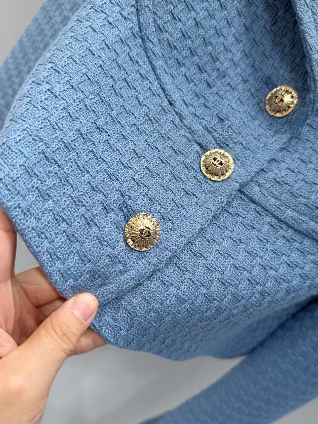 整套採用了極具質感的霧霾藍色調,優雅又顯白。最讓人驚艷的是它的立體編織工藝,近看那個肌理感層次分明,細節控一定會愛死!