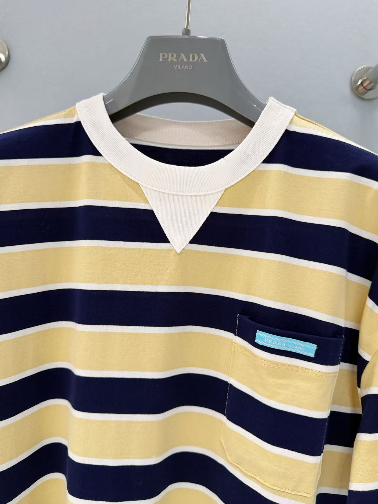 藍、黃、白三色交織的橫條紋設計,視覺上非常清爽且充滿活力。細節處更是亮點:左胸前設有精緻的小口袋,並點綴了標誌性的藍色品牌標籤,低調卻極具辨識度。