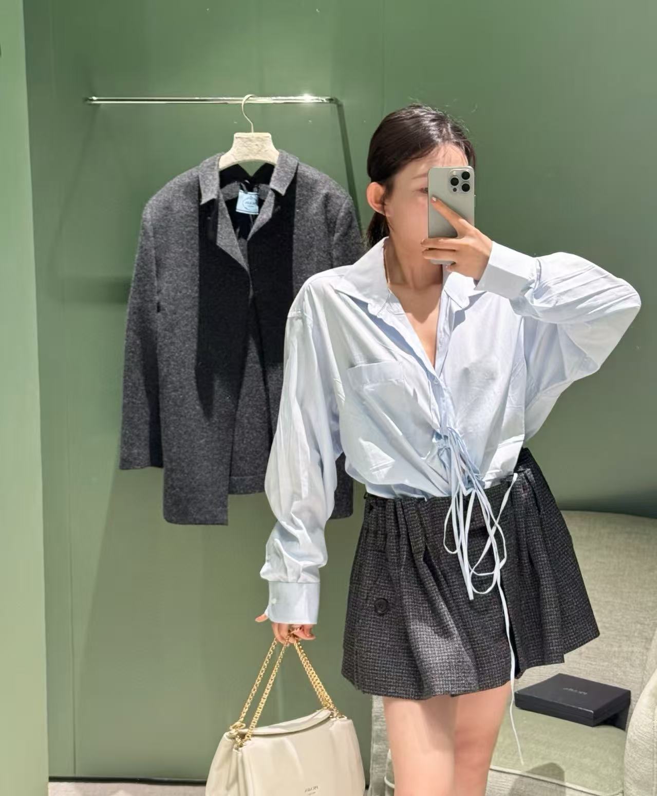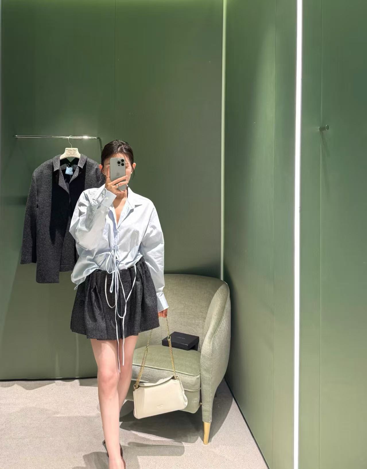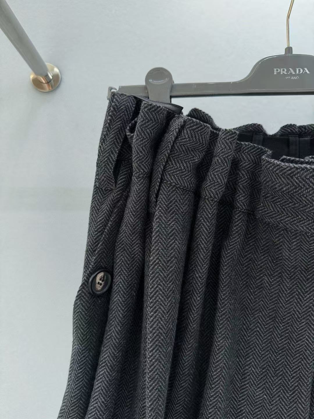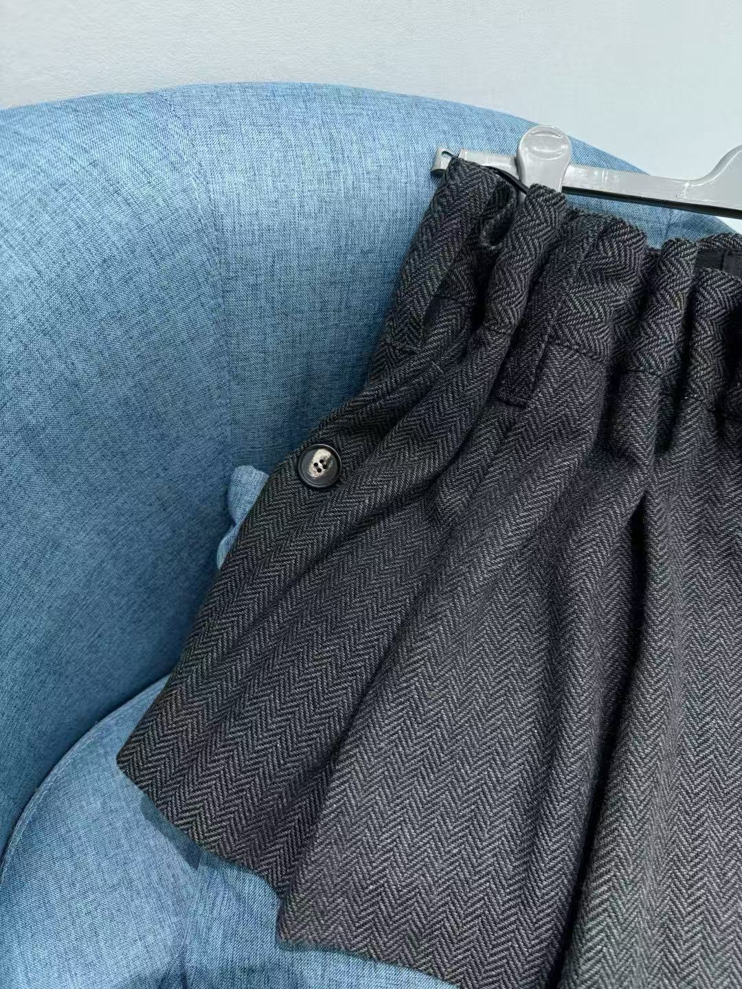 這件半裙真的細節滿滿!A 字版型加上兩側自然收褶,修飾身形的同時又帶點俐落氣質。