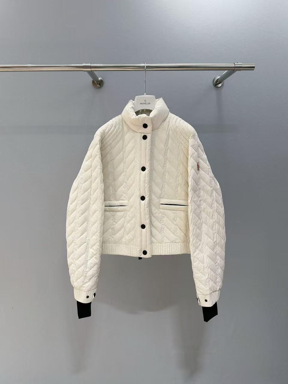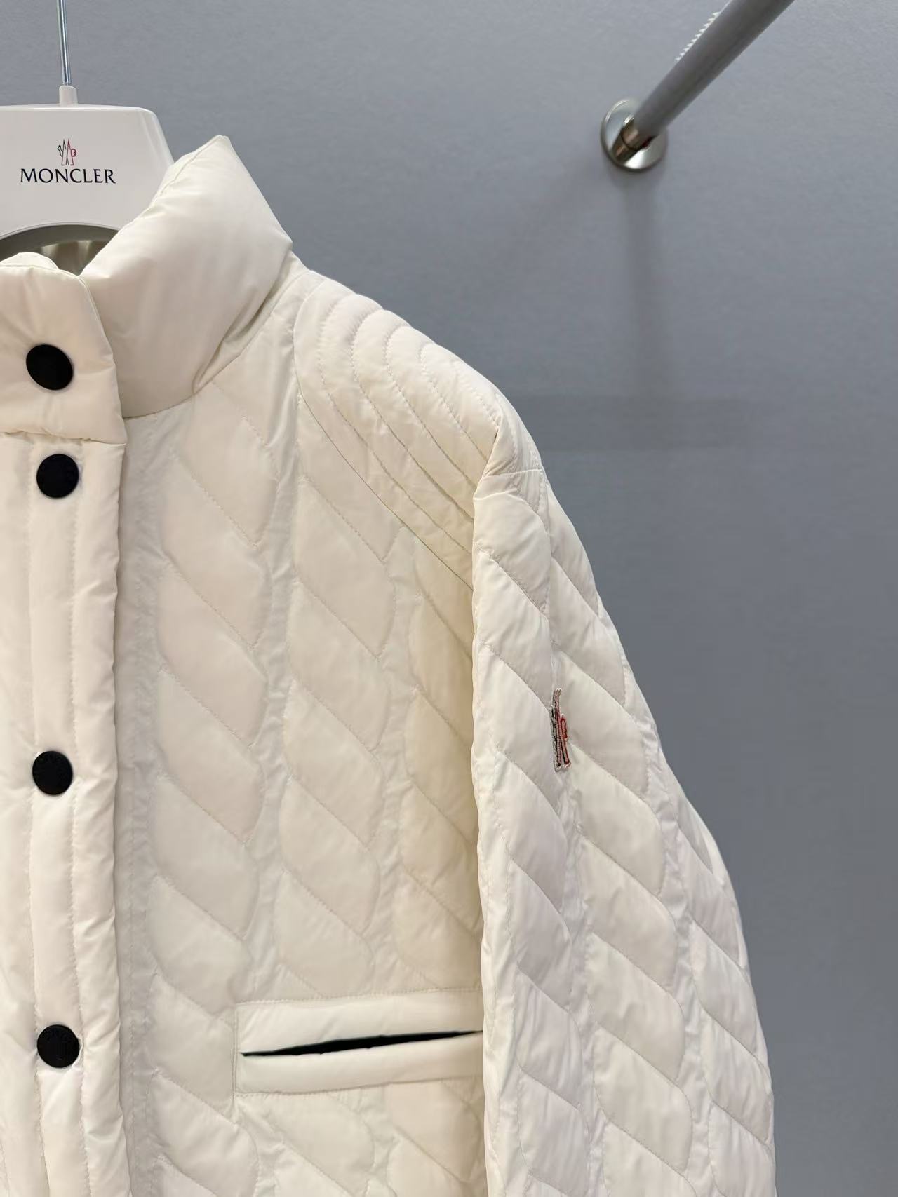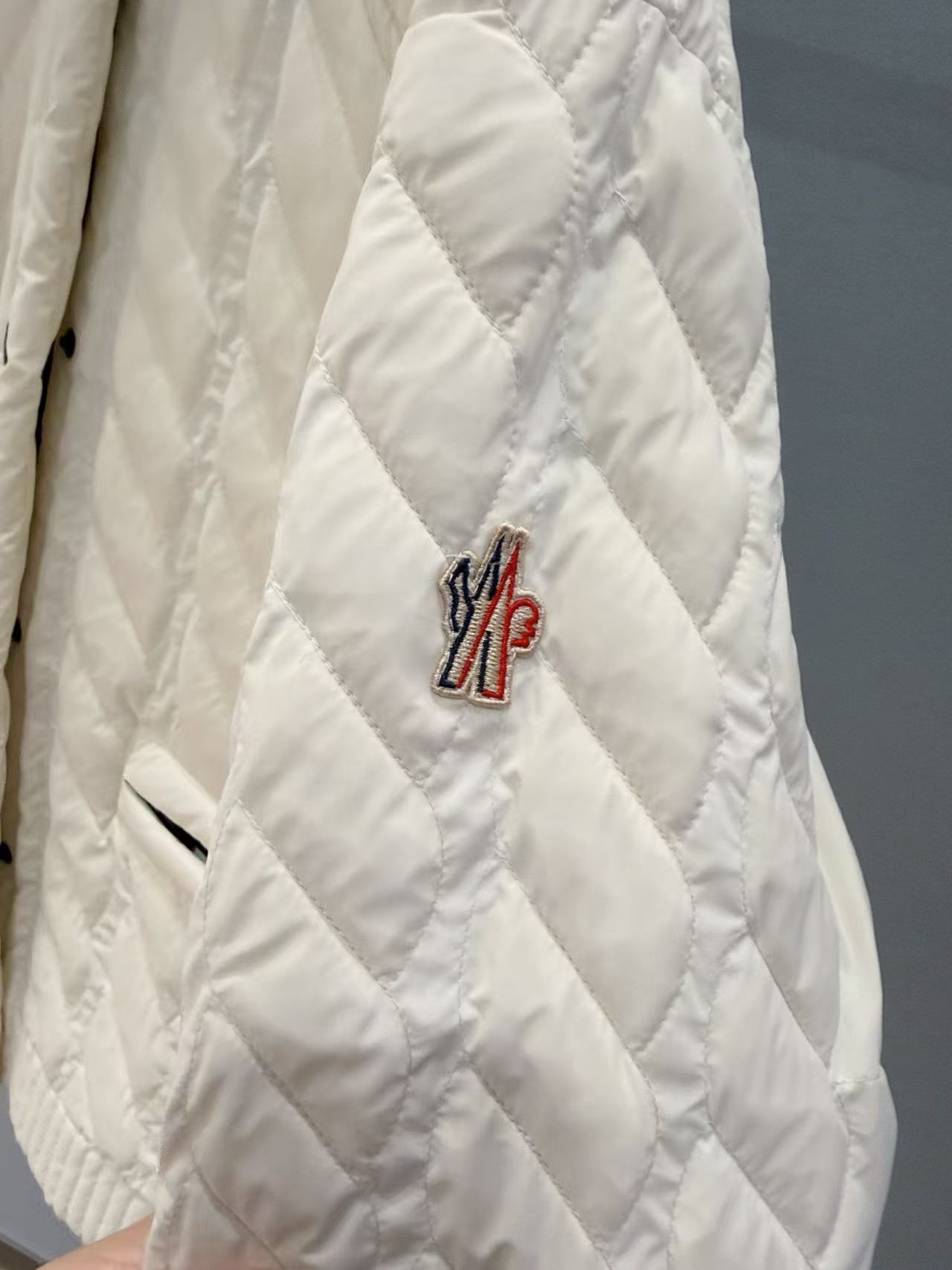 肩側豎狀排列壓線,搭配橫向長方格壓紋,交錯走線,疊加拉鏈口袋+螺紋袖口,設計豐富多變。