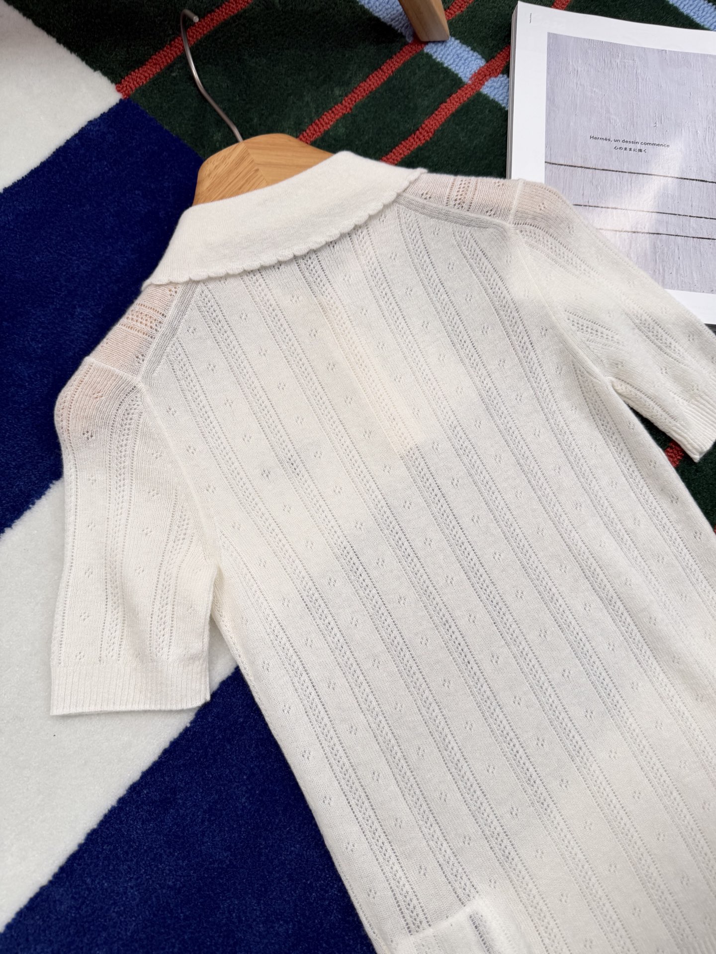 整件採用細緻鏤空針織工藝,織紋層次分明,視覺上輕盈又不單調,讓原本簡約的 POLO 版型多了一份時髦感。