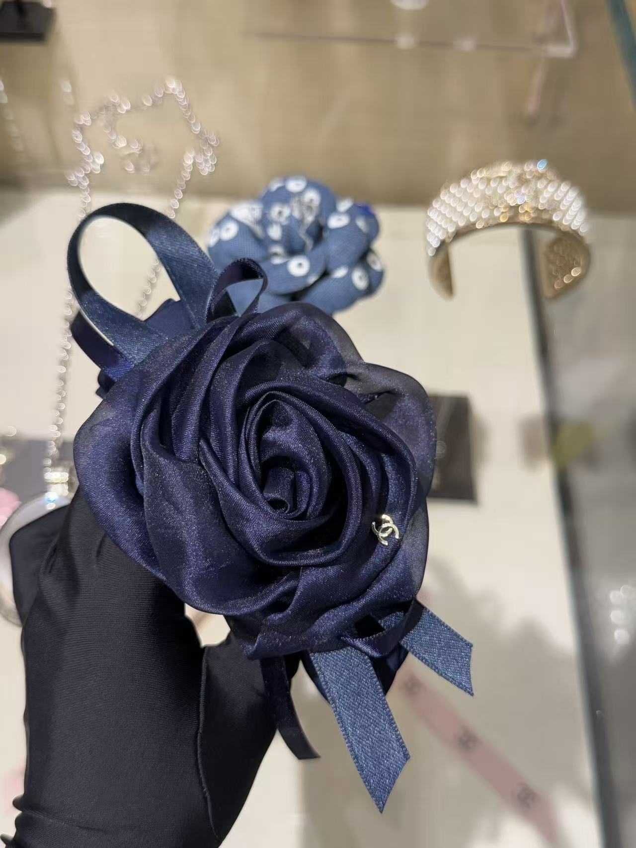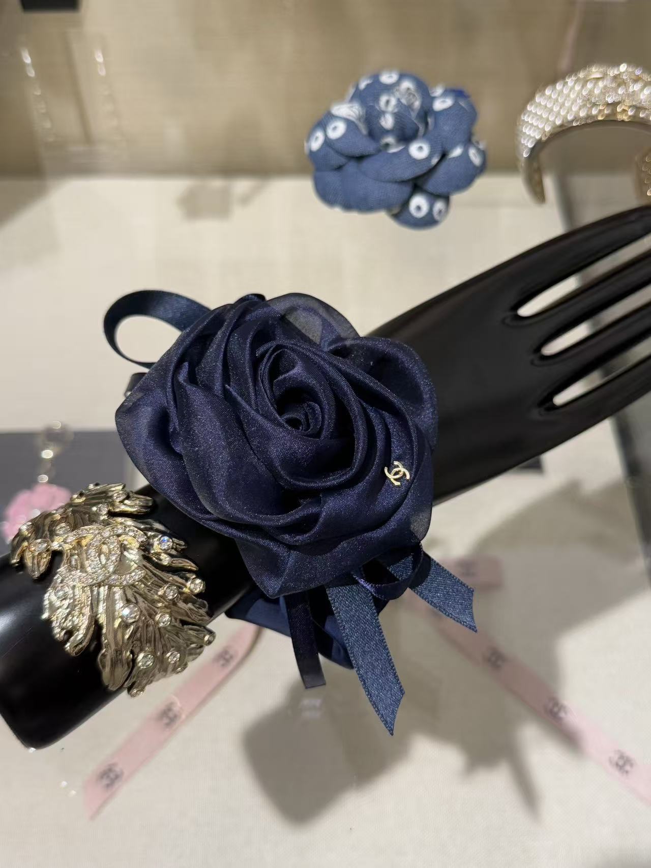 深邃的午夜藍緞面打底,立體網紗山茶花層層綻放,旁邊綁著同色系織帶蝴蝶結,