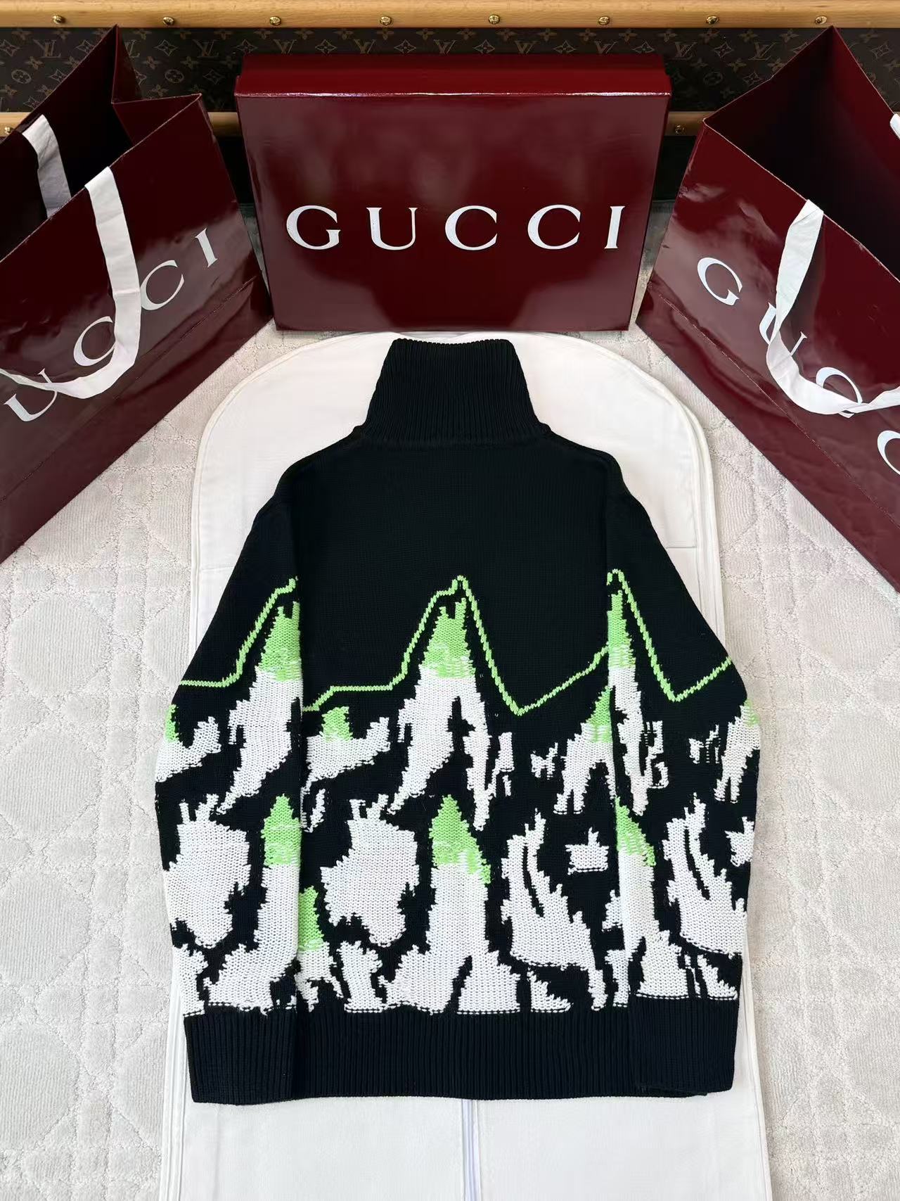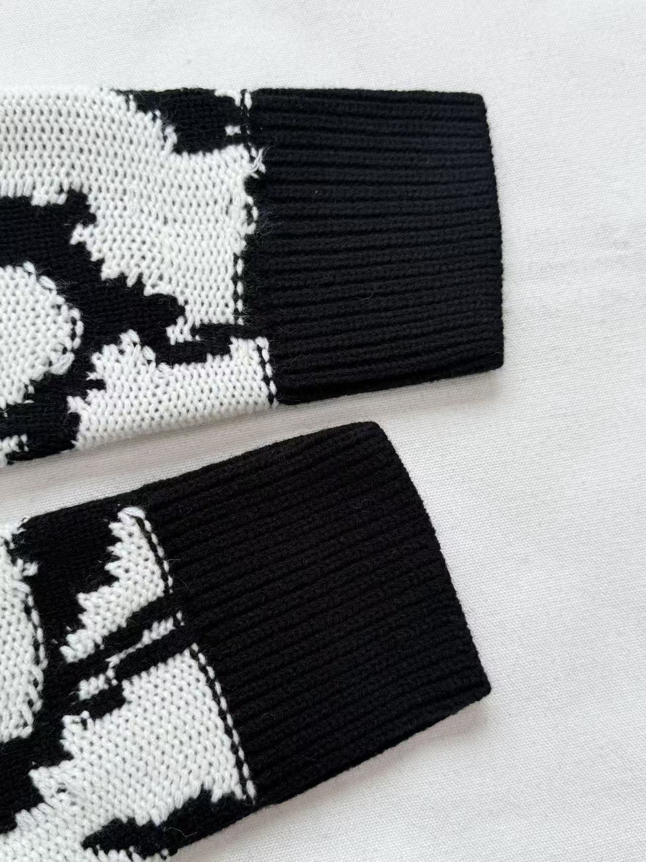 這款外套以細膩的拼色嵌花工藝呈現出一幅生動的山景圖騰,並巧妙融入品牌字母元素,打破了傳統針織衫的單一框架。