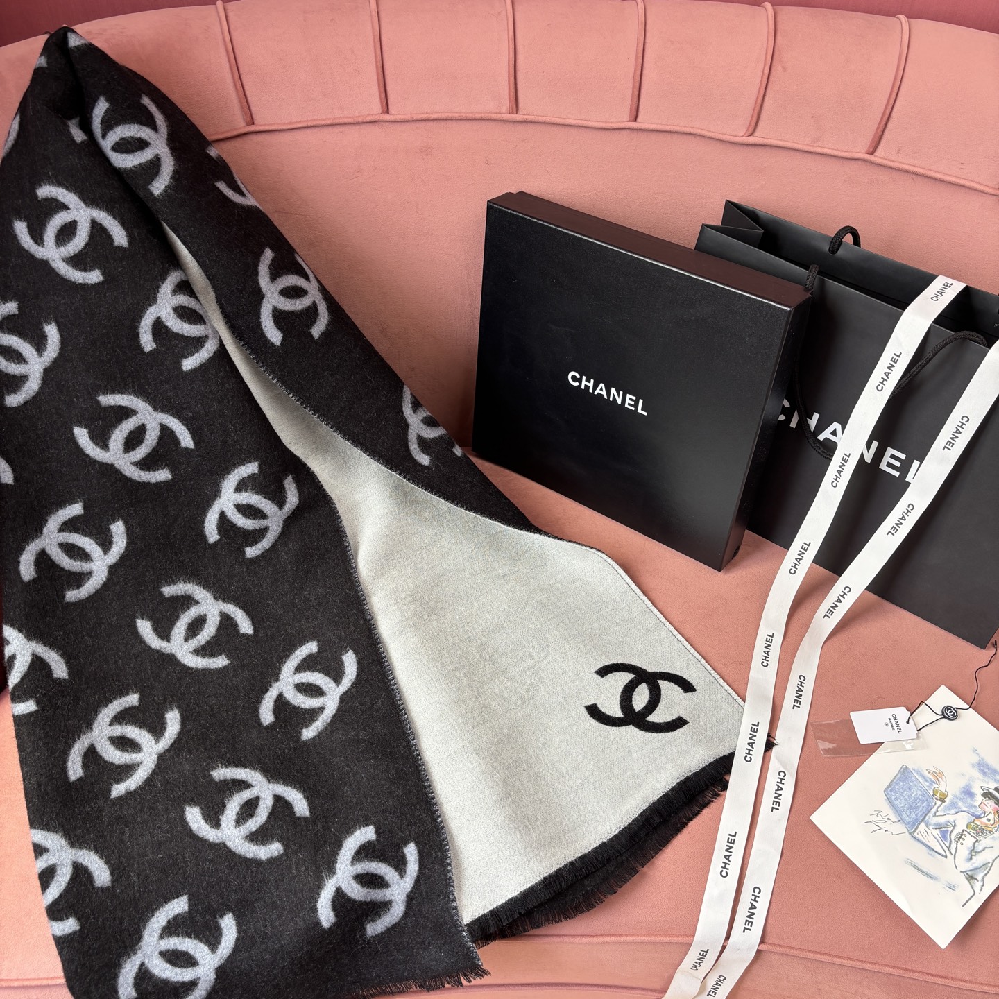 整體呈現柔和暈染的色調,配上經典雙C圖案設計,一面是滿版大雙C,另一面則是簡約的Logo樣式,兩種風格自由轉換,不論哪一面都高級又耐看。