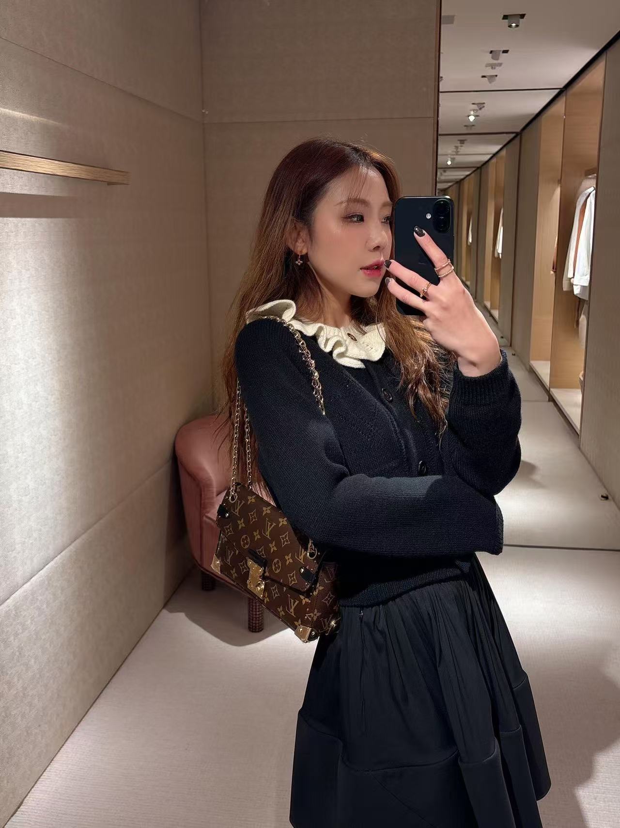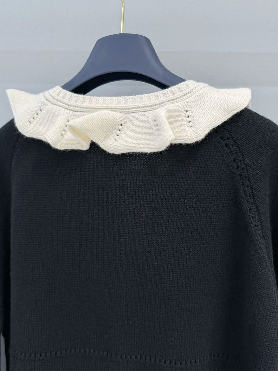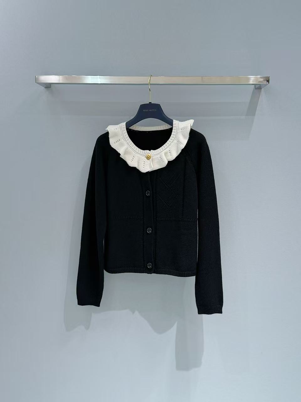 領口那圈奶白色的針織荷葉邊真的太美了,軟綿綿的褶皺帶來滿滿松弛感,再搭配金色 Monogram 紐扣,甜度剛好,不會過頭,瞬間提升整件衣服的精緻度。