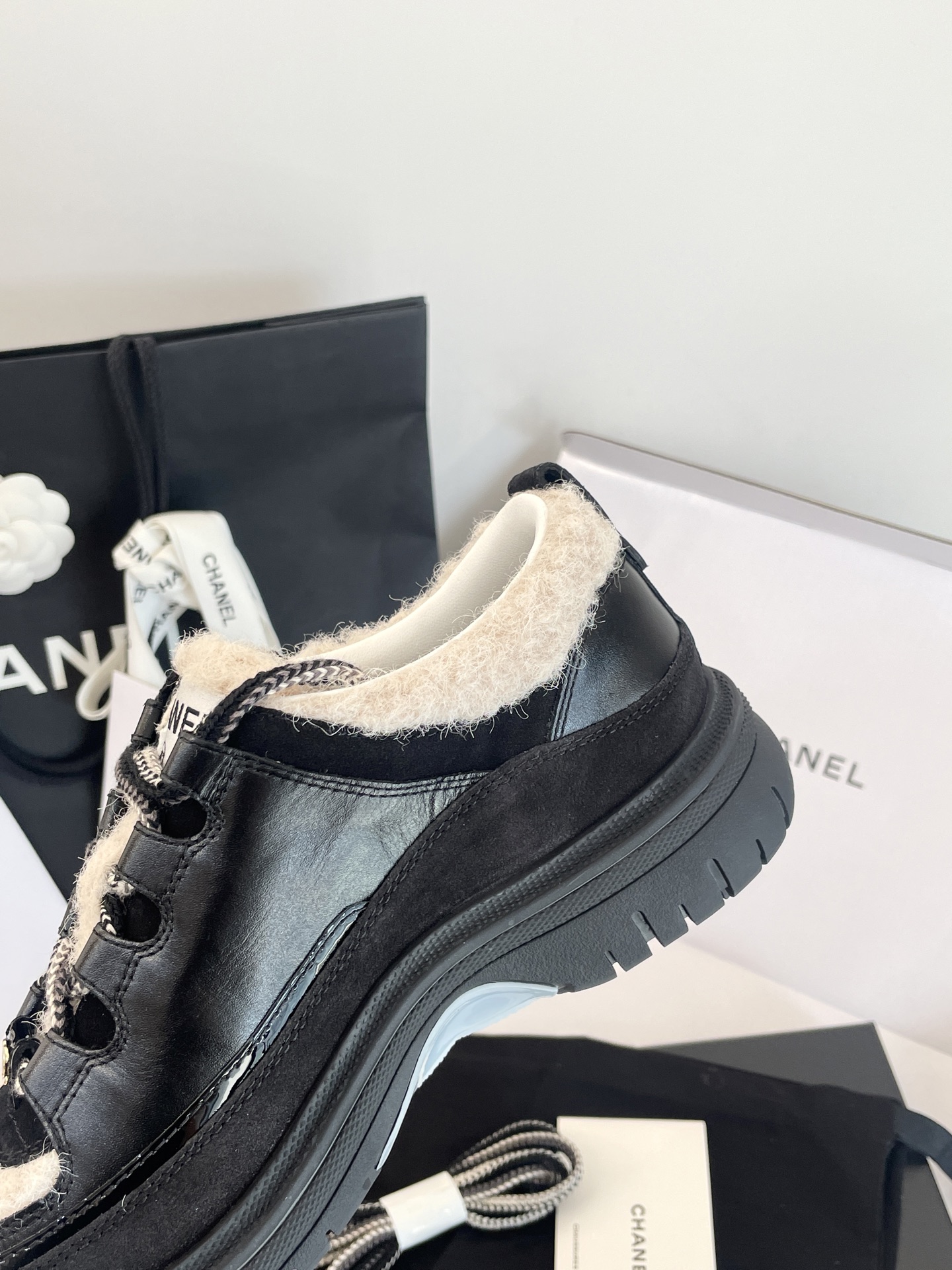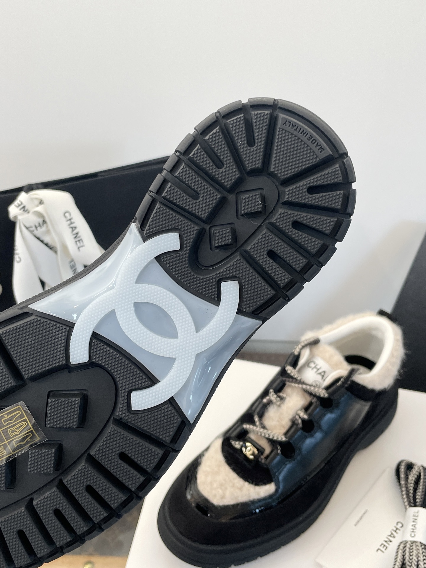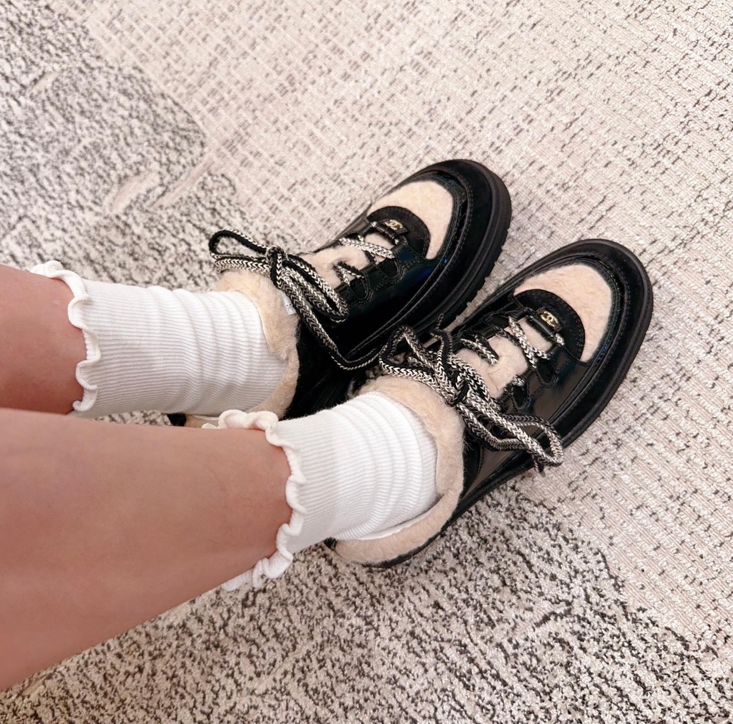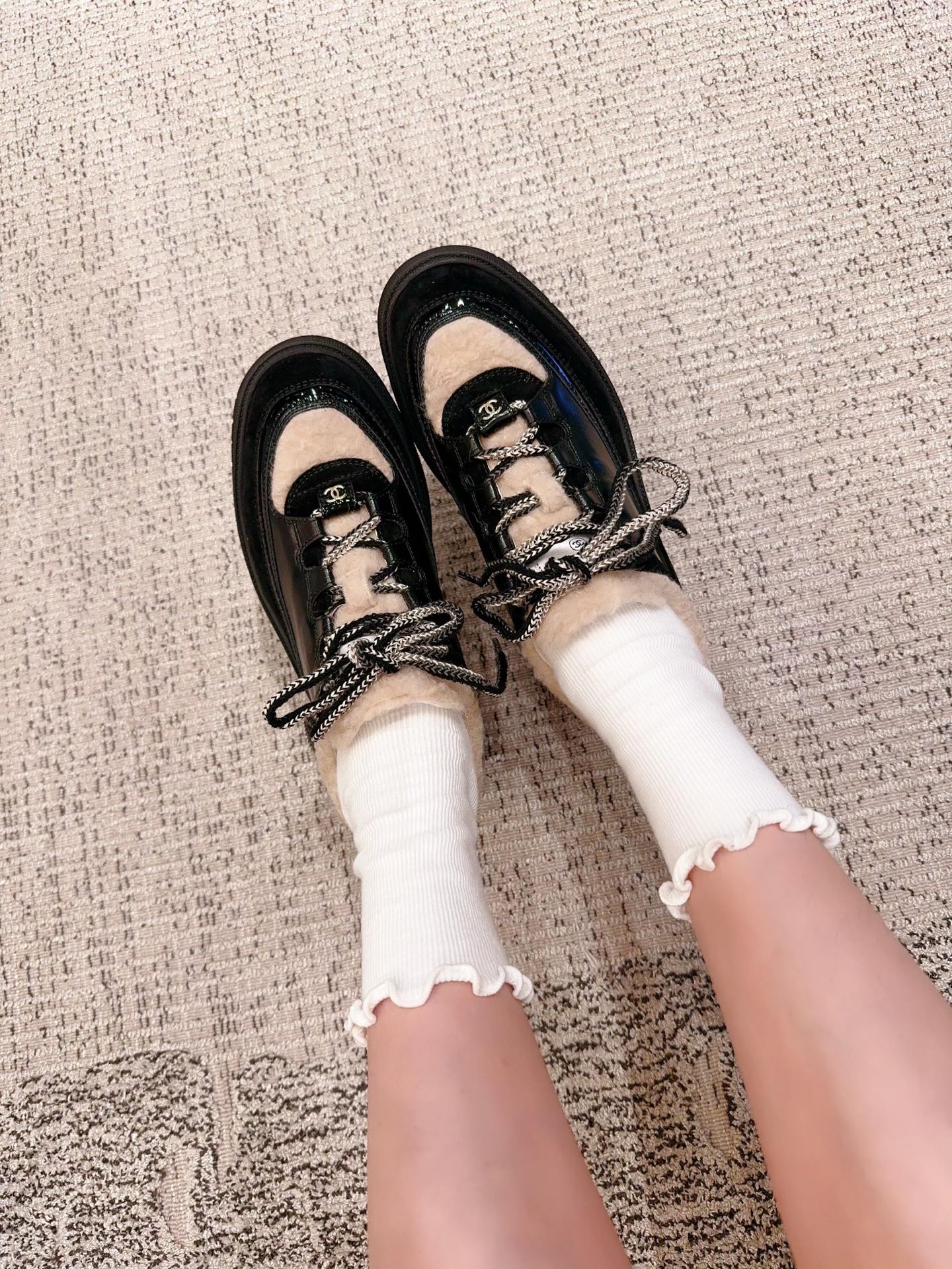 鞋面:亮面小牛皮、牛反絨、牛漆皮,拼接杏色布底羊毛,視覺層次感滿分。