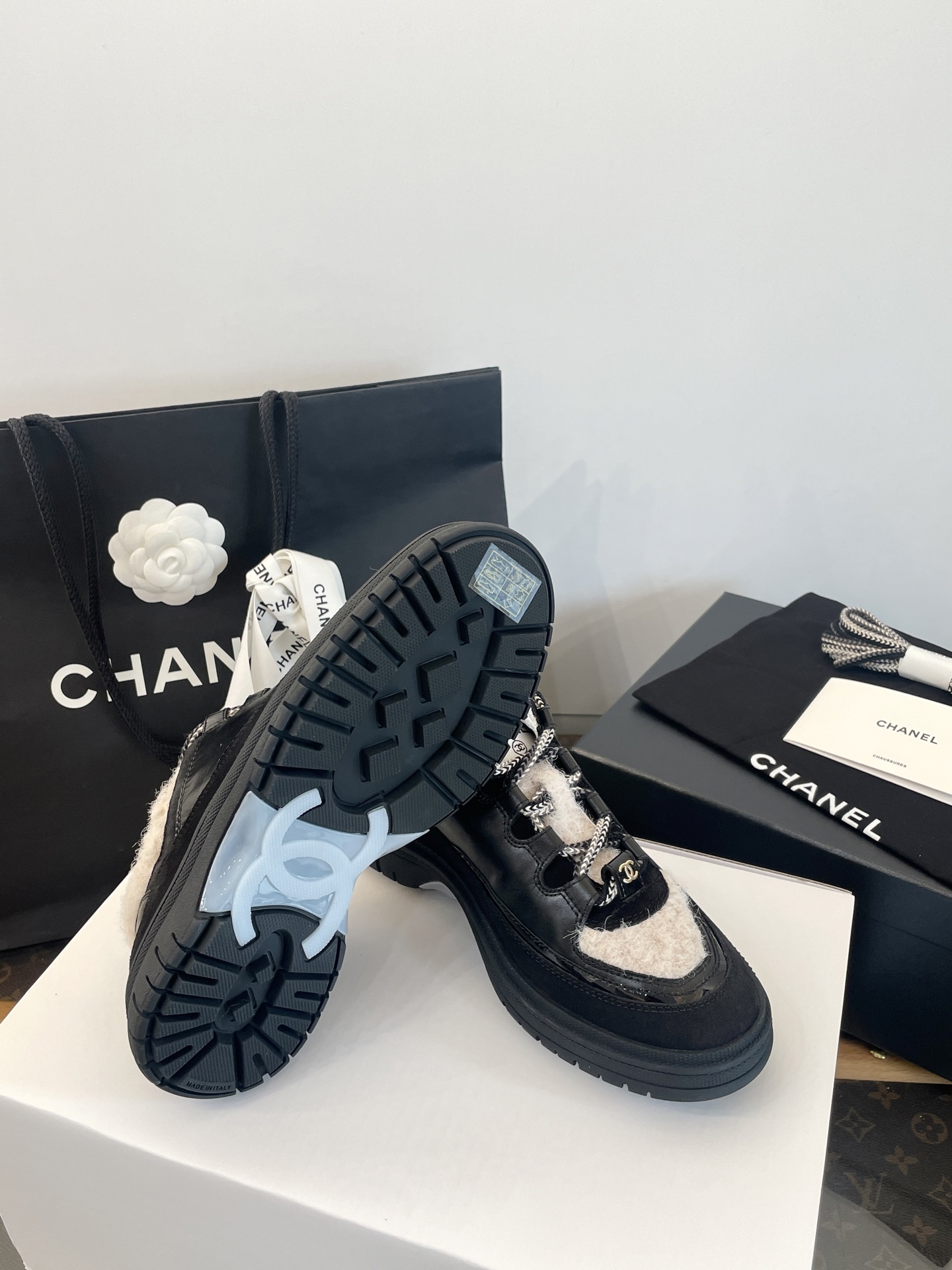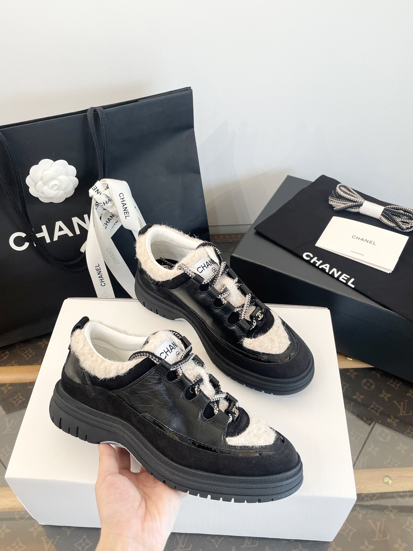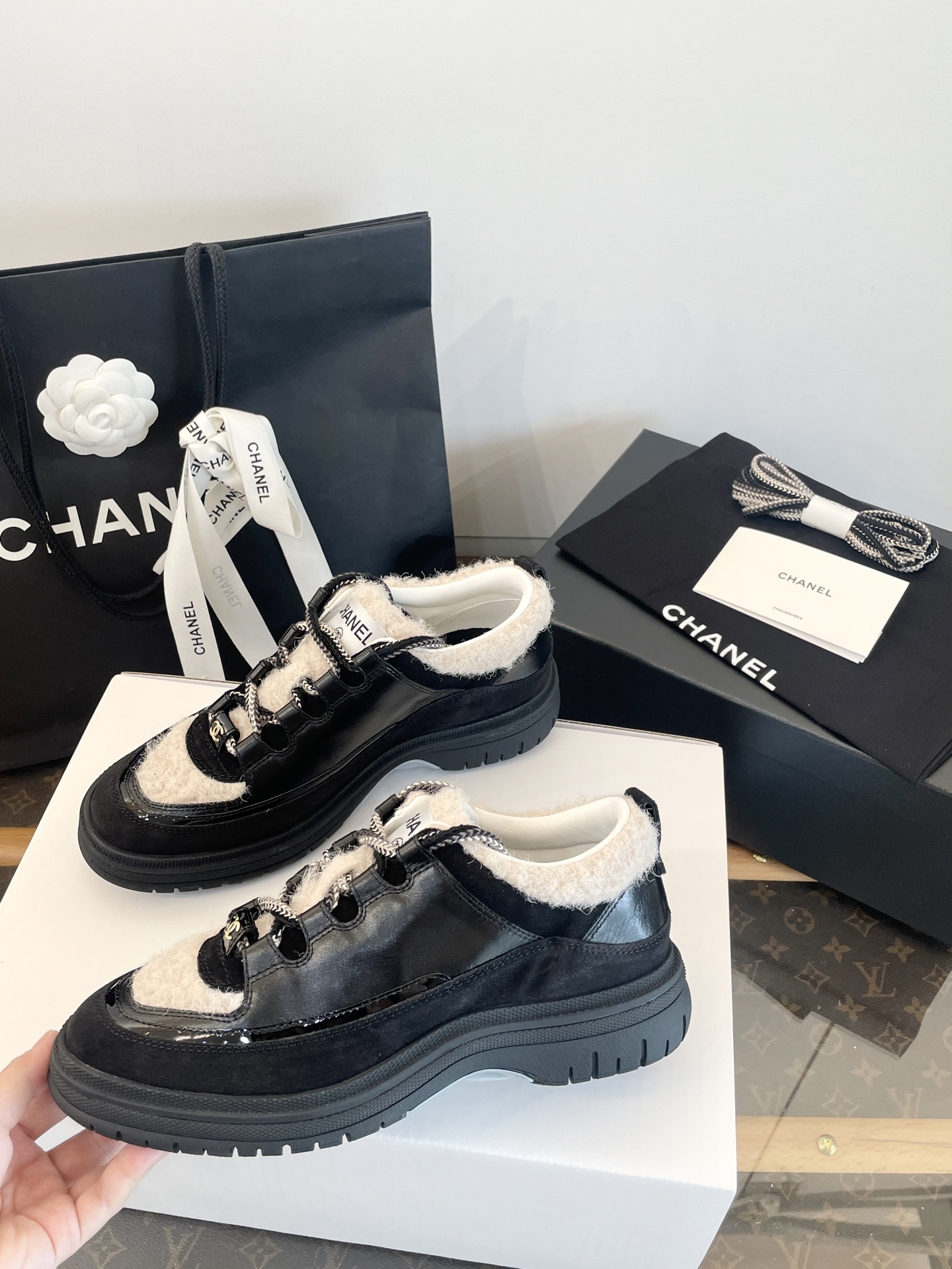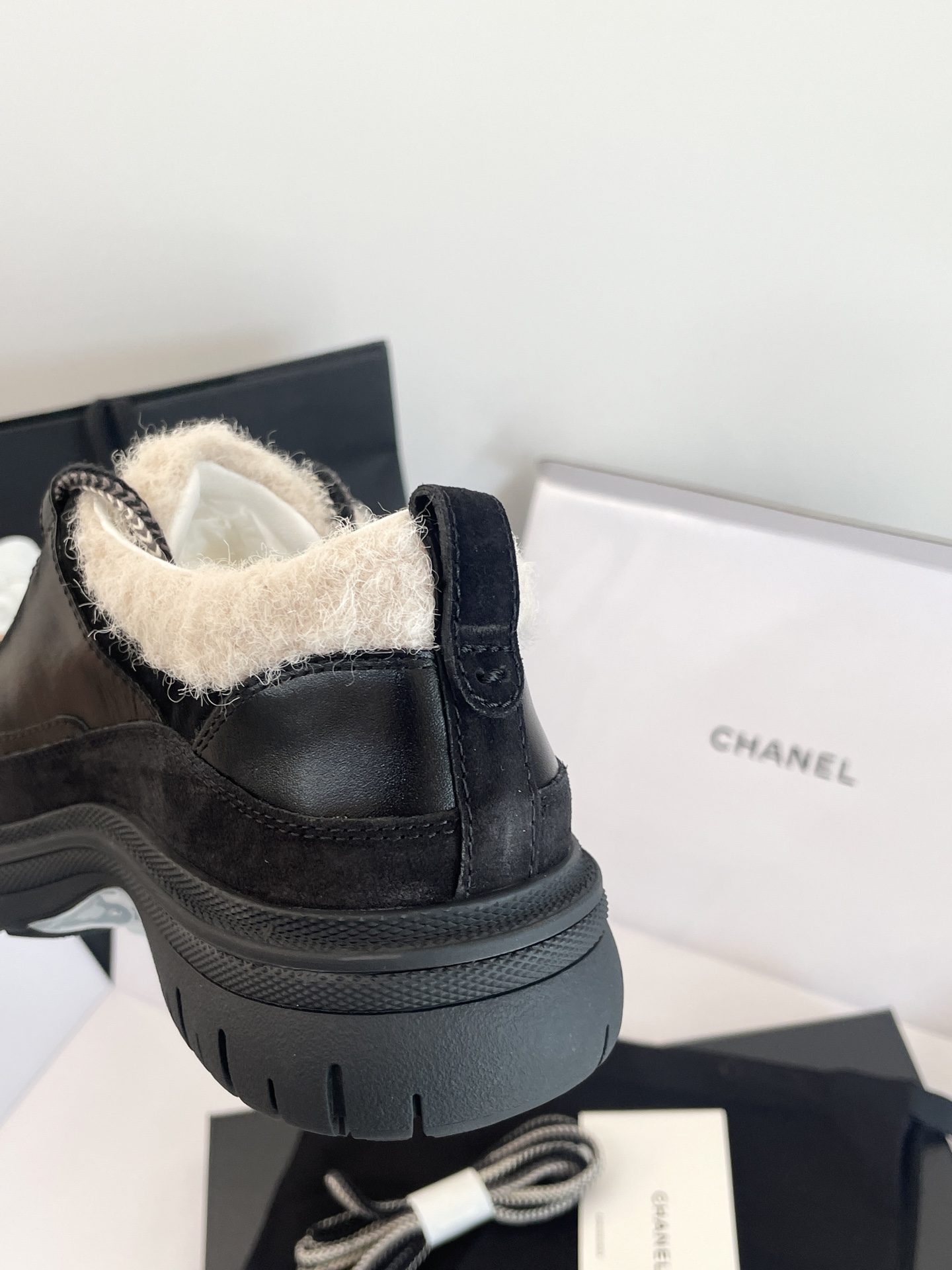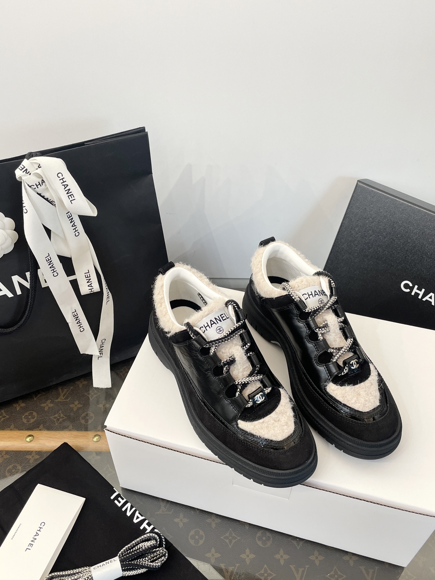 鞋面:亮面小牛皮、牛反絨、牛漆皮,拼接杏色布底羊毛,視覺層次感滿分。