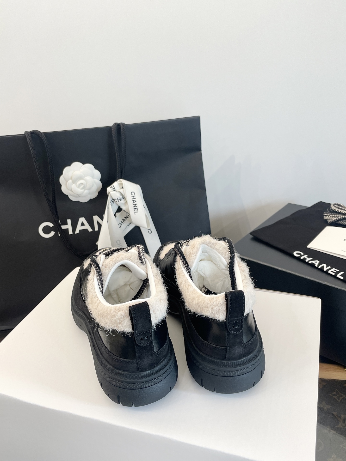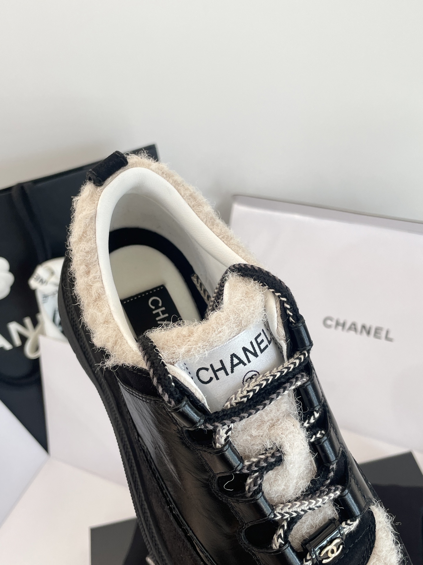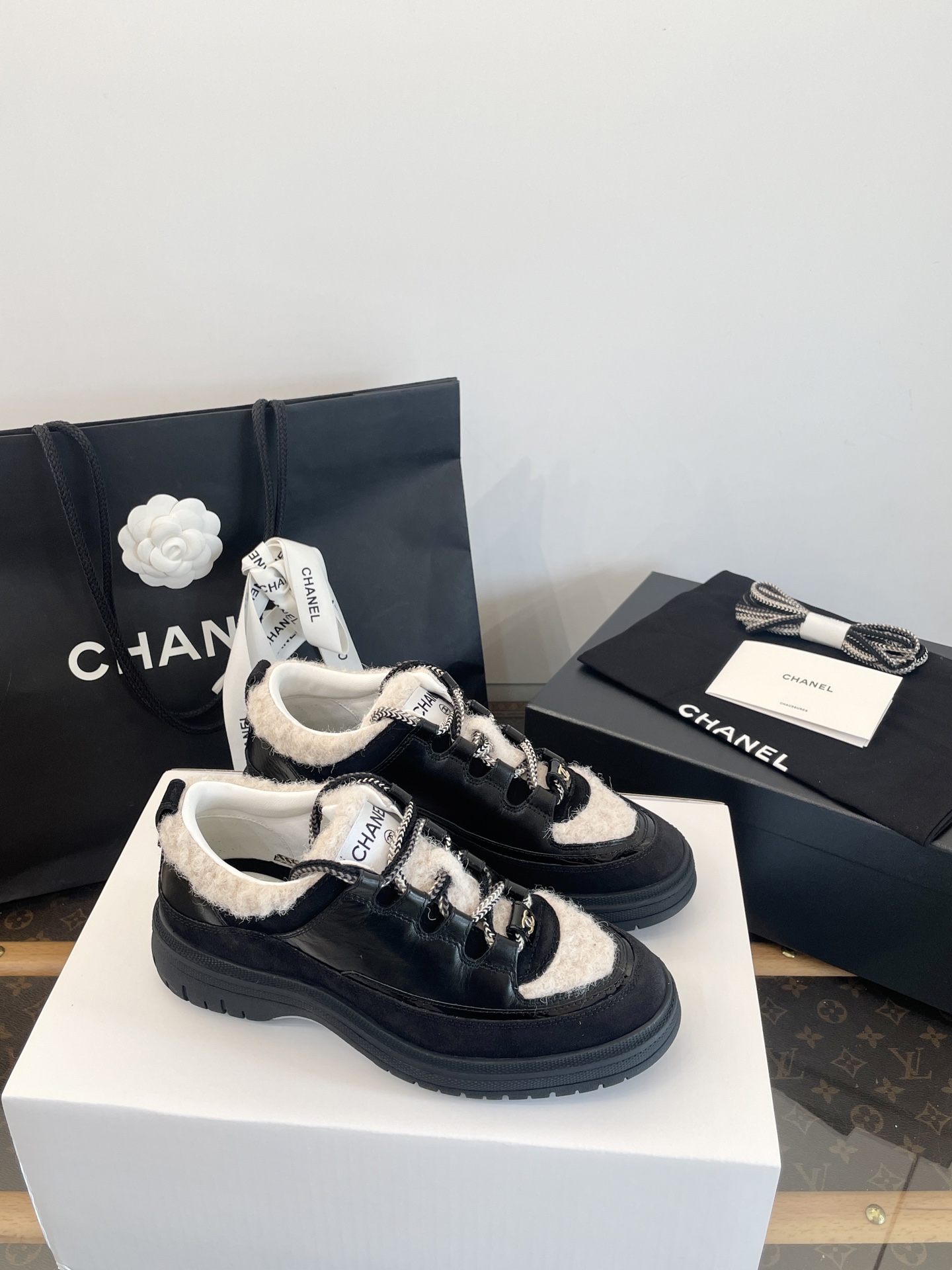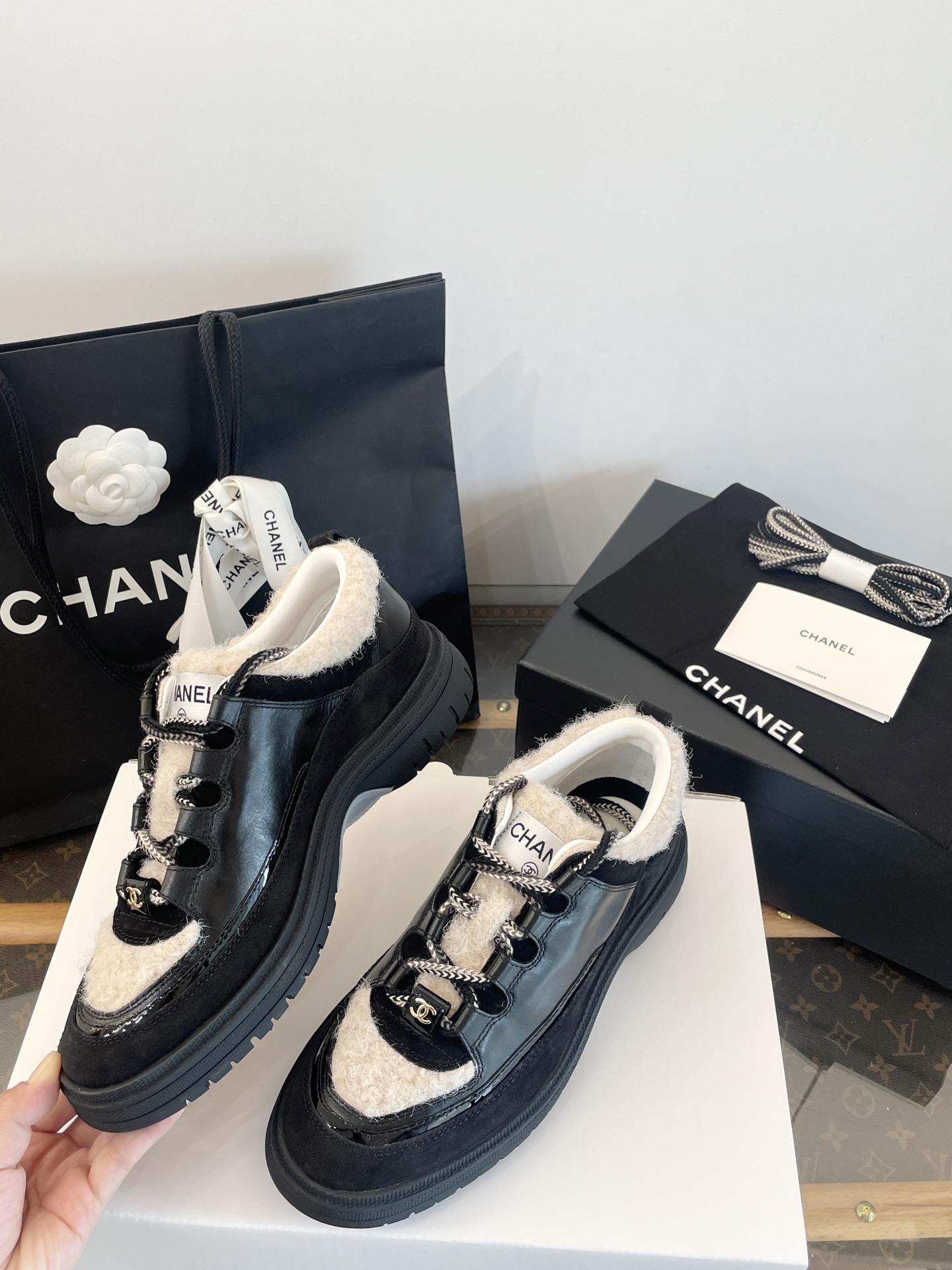 鞋面:亮面小牛皮、牛反絨、牛漆皮,拼接杏色布底羊毛,視覺層次感滿分。
