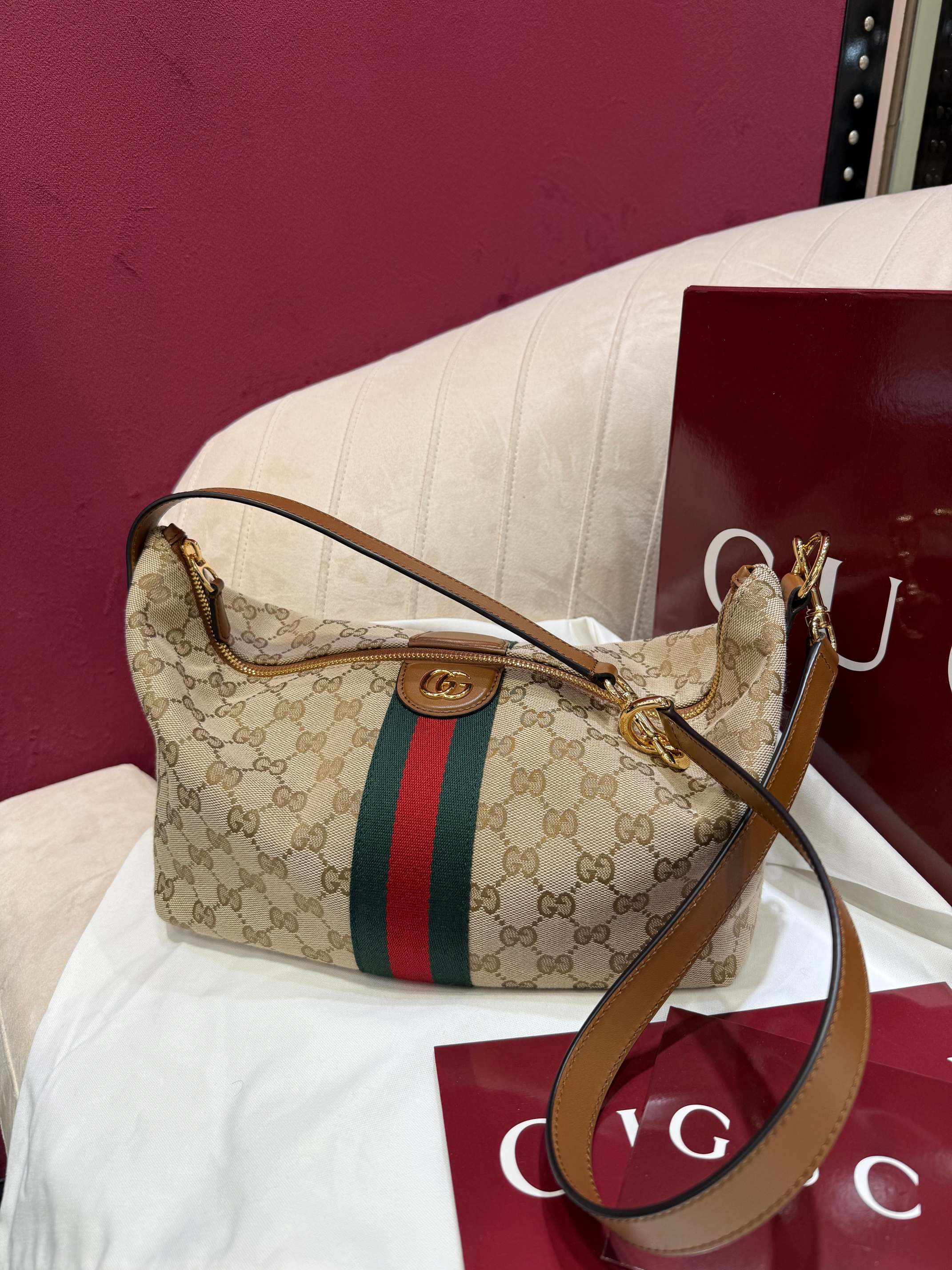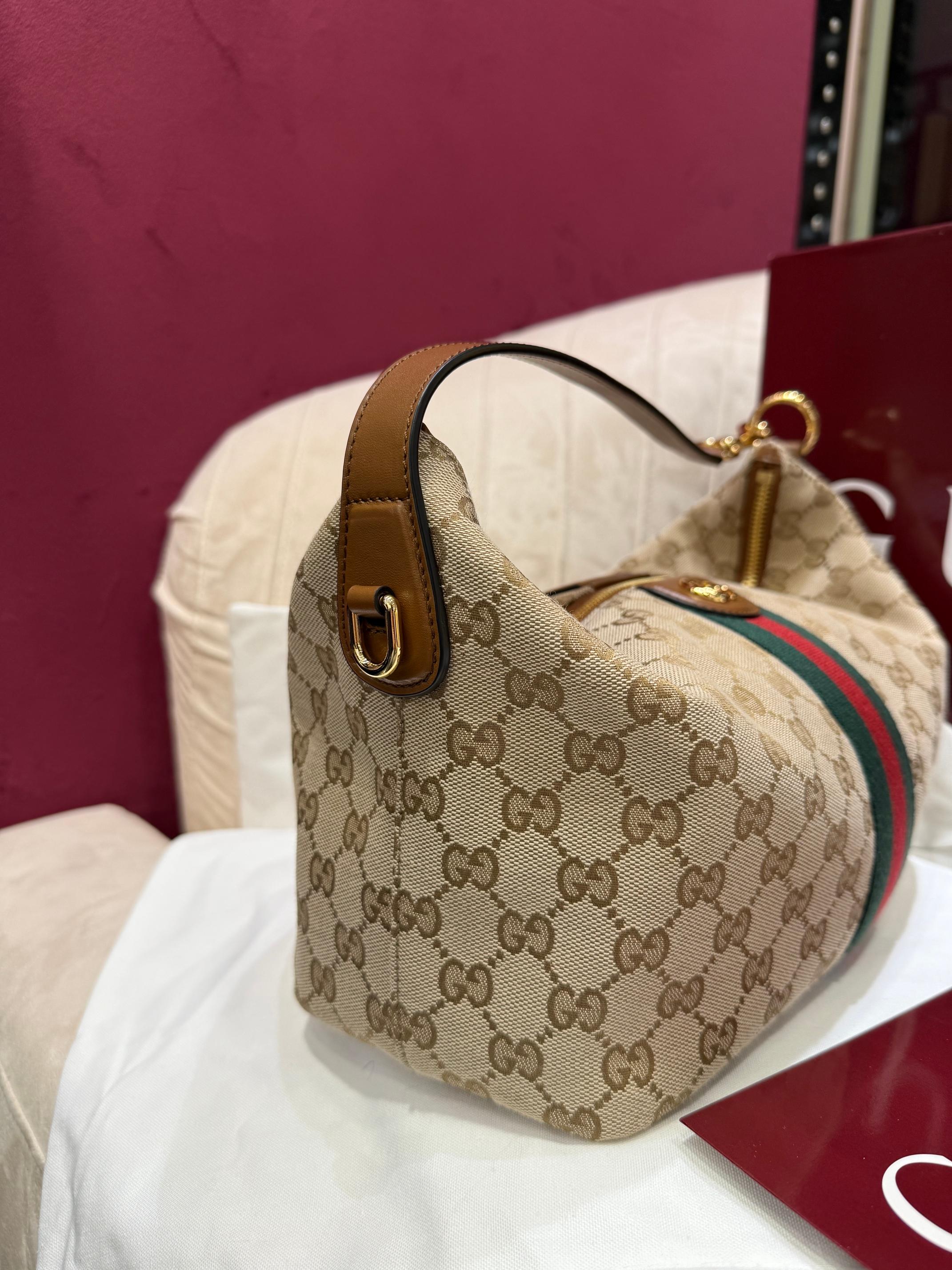 經典米色與棕色 GG 帆布搭配棕色皮革滾邊,整體視覺溫潤耐看,完全不挑季節、不挑穿搭。