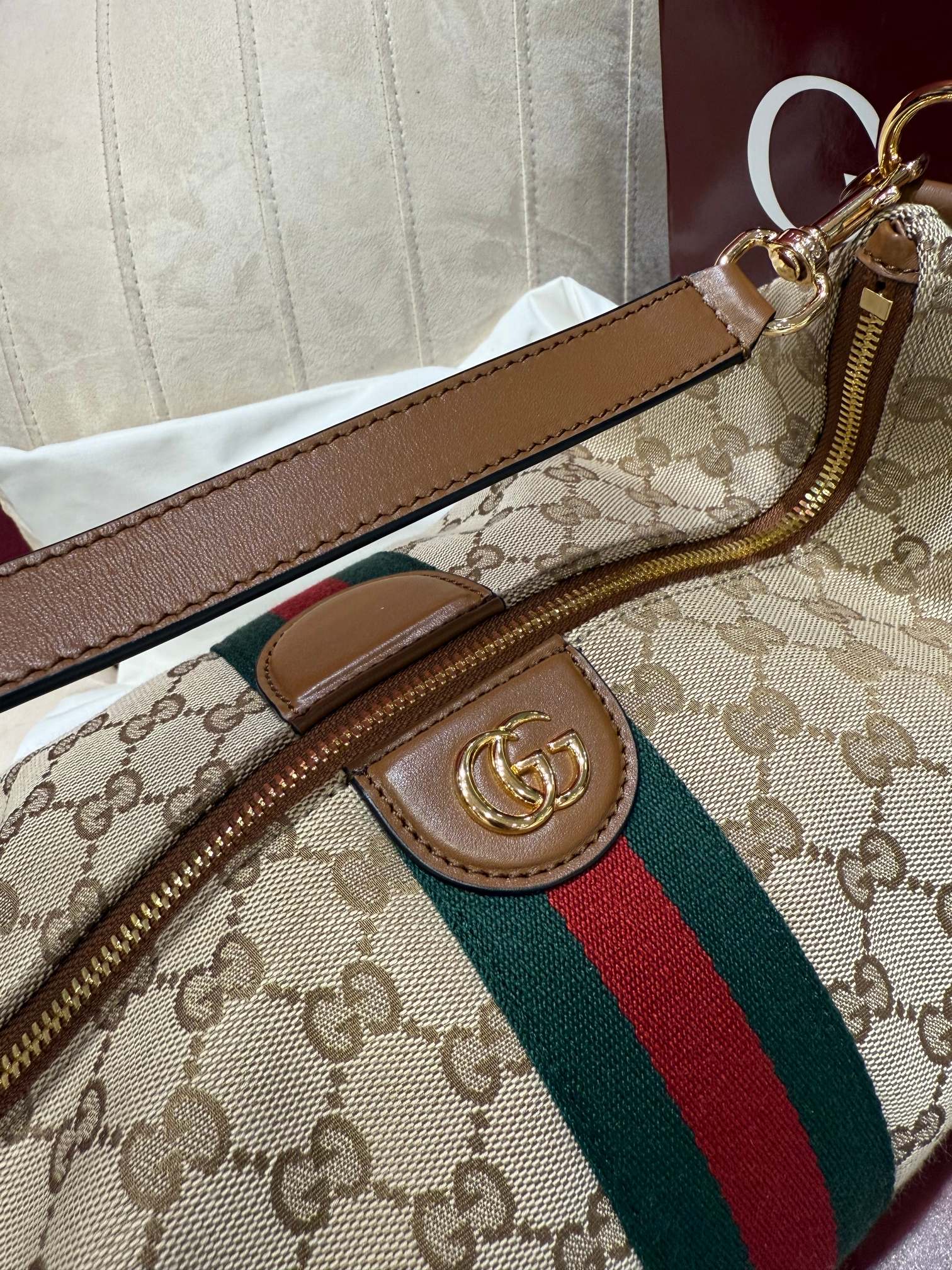 包身採用米色與棕色 GG 帆布,搭配棕色皮革滾邊,耐看又耐用。