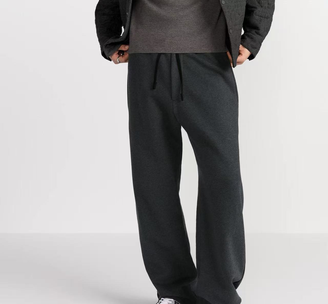 側邊的撞色擠邊條設計,不僅延伸了腿部線條,更為整體的灰調視覺注入了俐落的層次感。