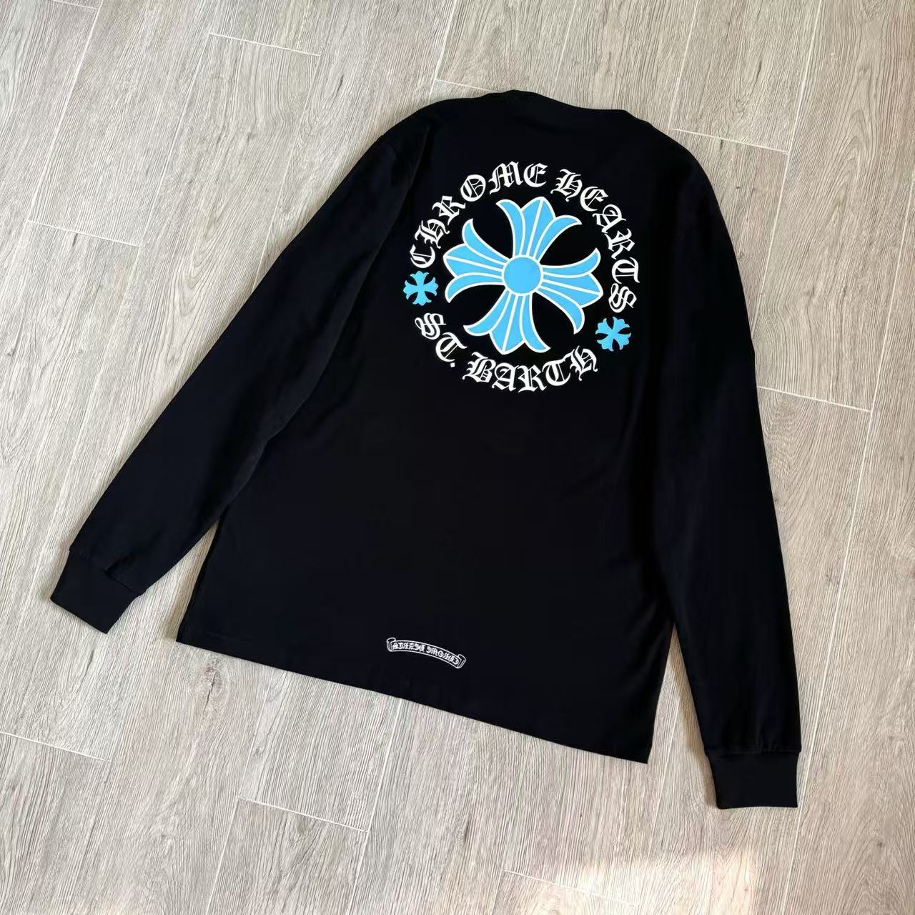 這次分享的是來自加勒比海度假勝地的 St. Barth 聖巴托島限定款。不同於經典款的黑白配色,這款長袖 T 恤背後採用了極具度假氛圍的湛藍色十字花,在純黑的底色襯托下,散發出一種前衛且深邃的視覺衝擊感。