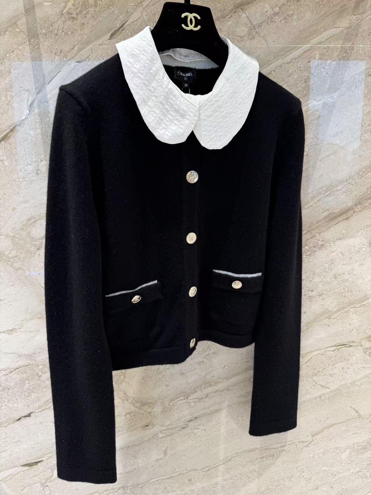 這款開衫最迷人的地方在於那片白色可拆卸娃娃領。裝上領子時,自帶一種法式學院風的減齡感;拆掉領子後,立刻切換成極簡大方的圓領開衫,風格變換隨心所欲。