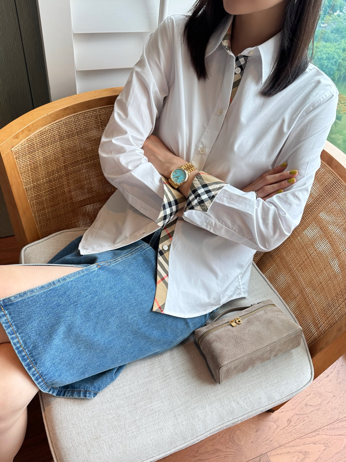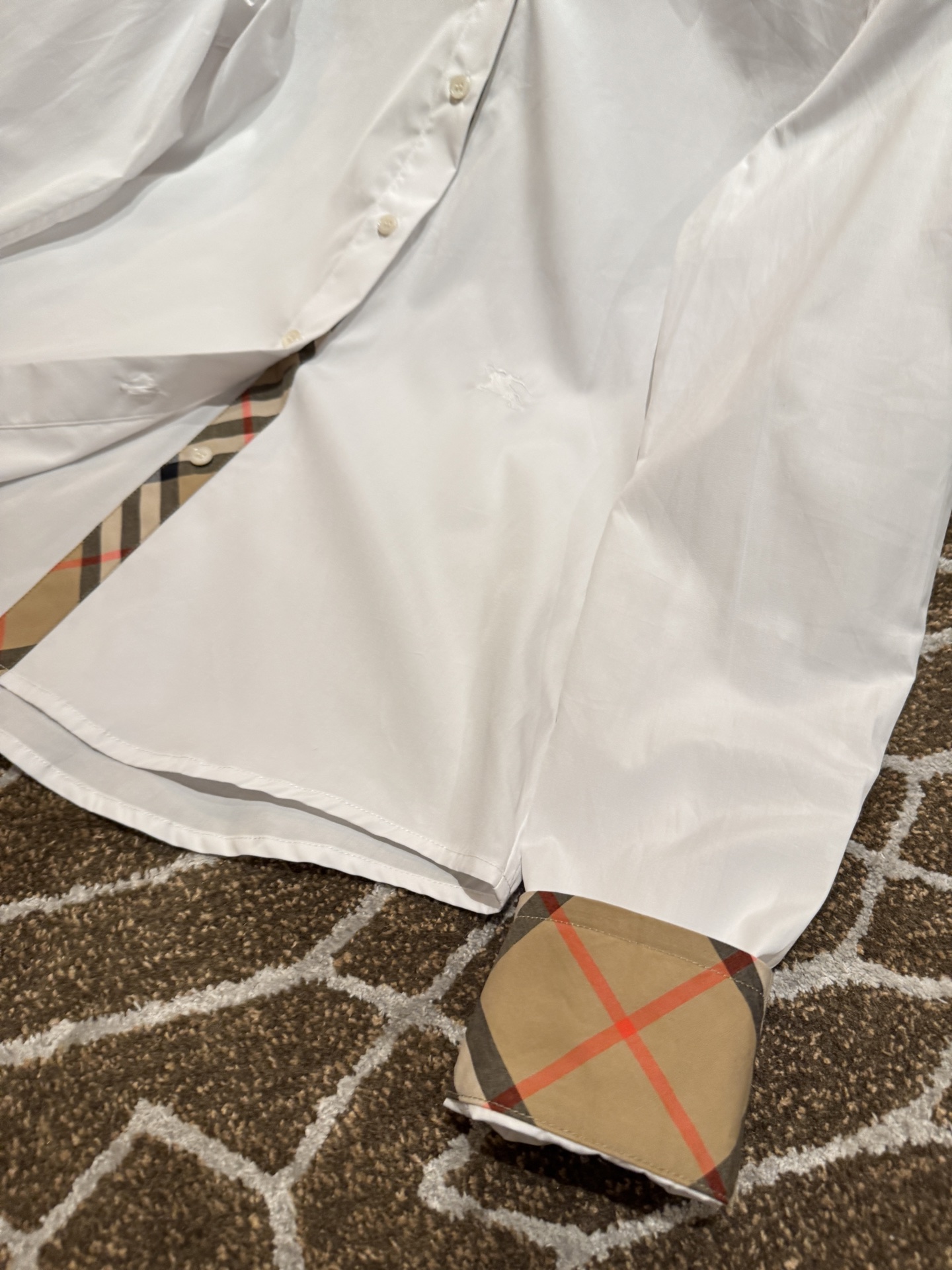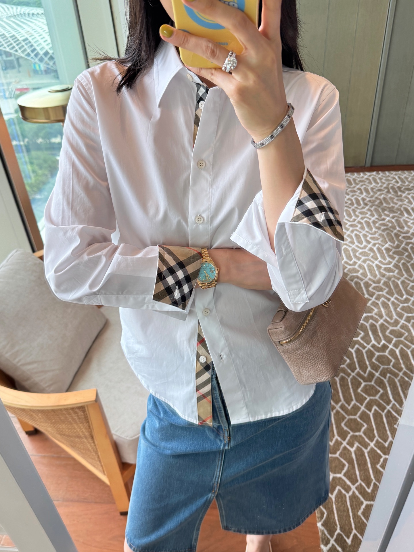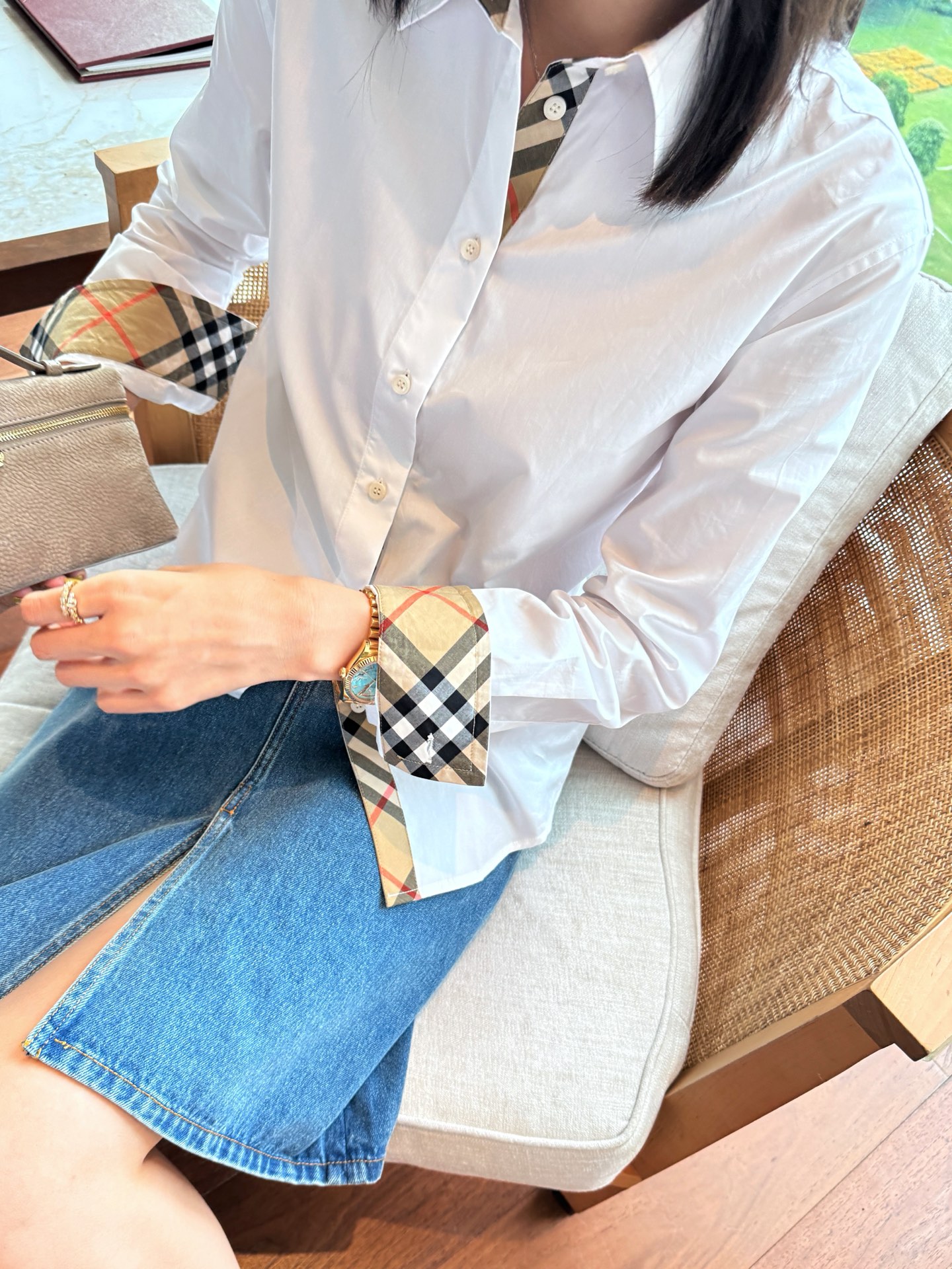 領口與袖口特別加入格紋拼接細節,低調卻是整件襯衫的靈魂設計,讓整體造型更有層次與亮點。