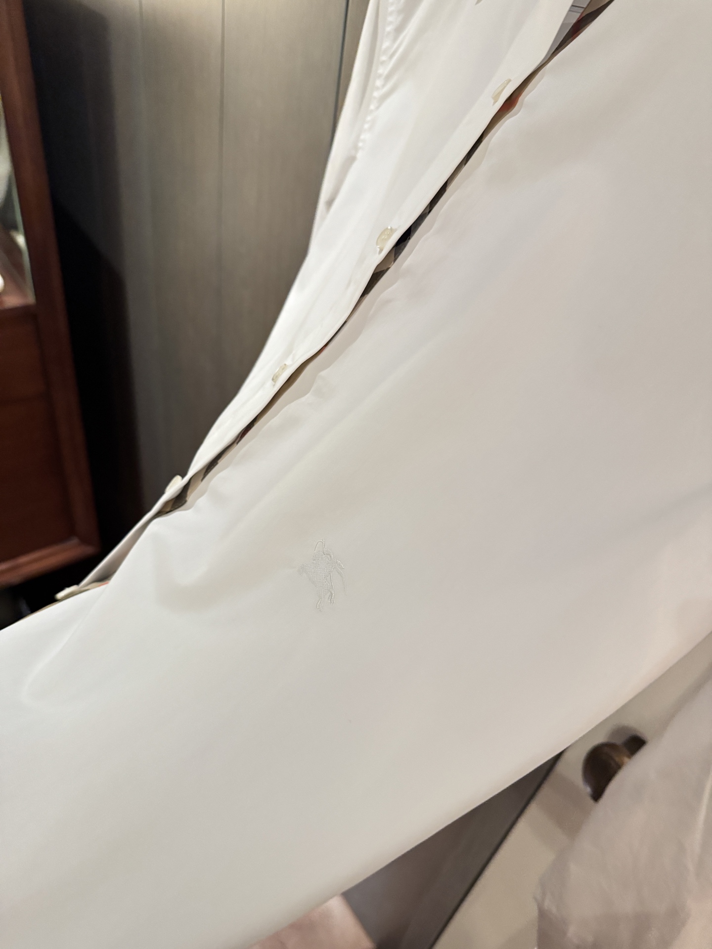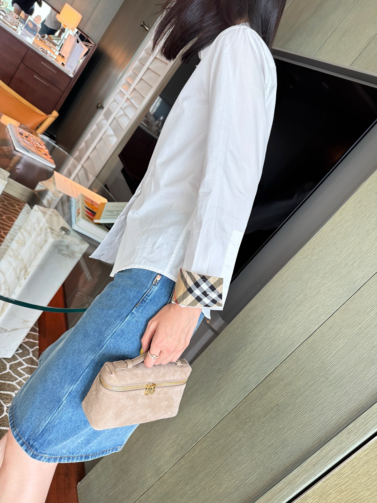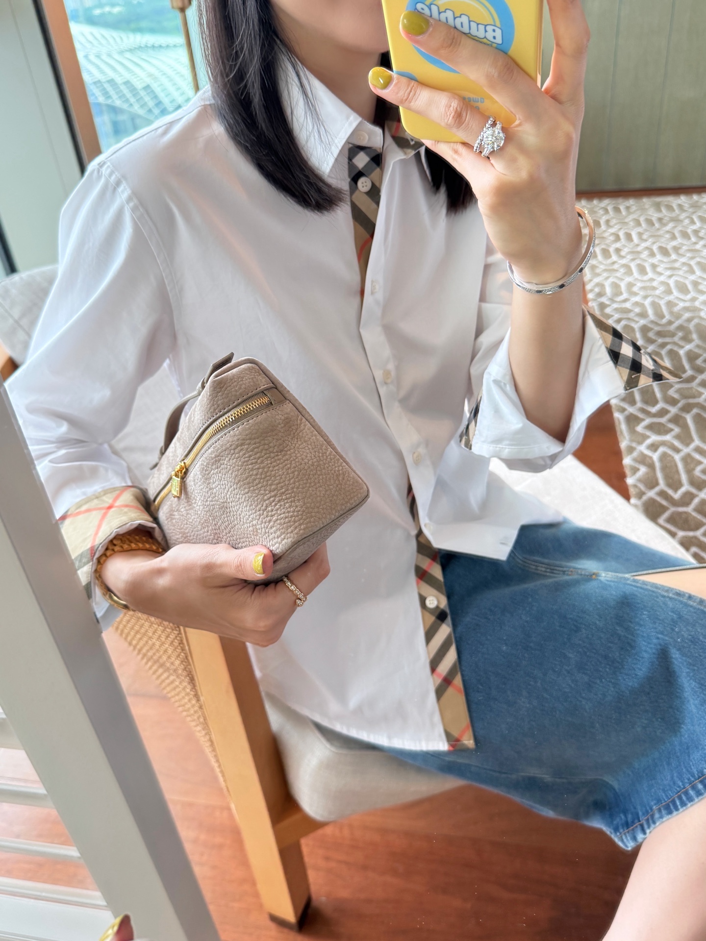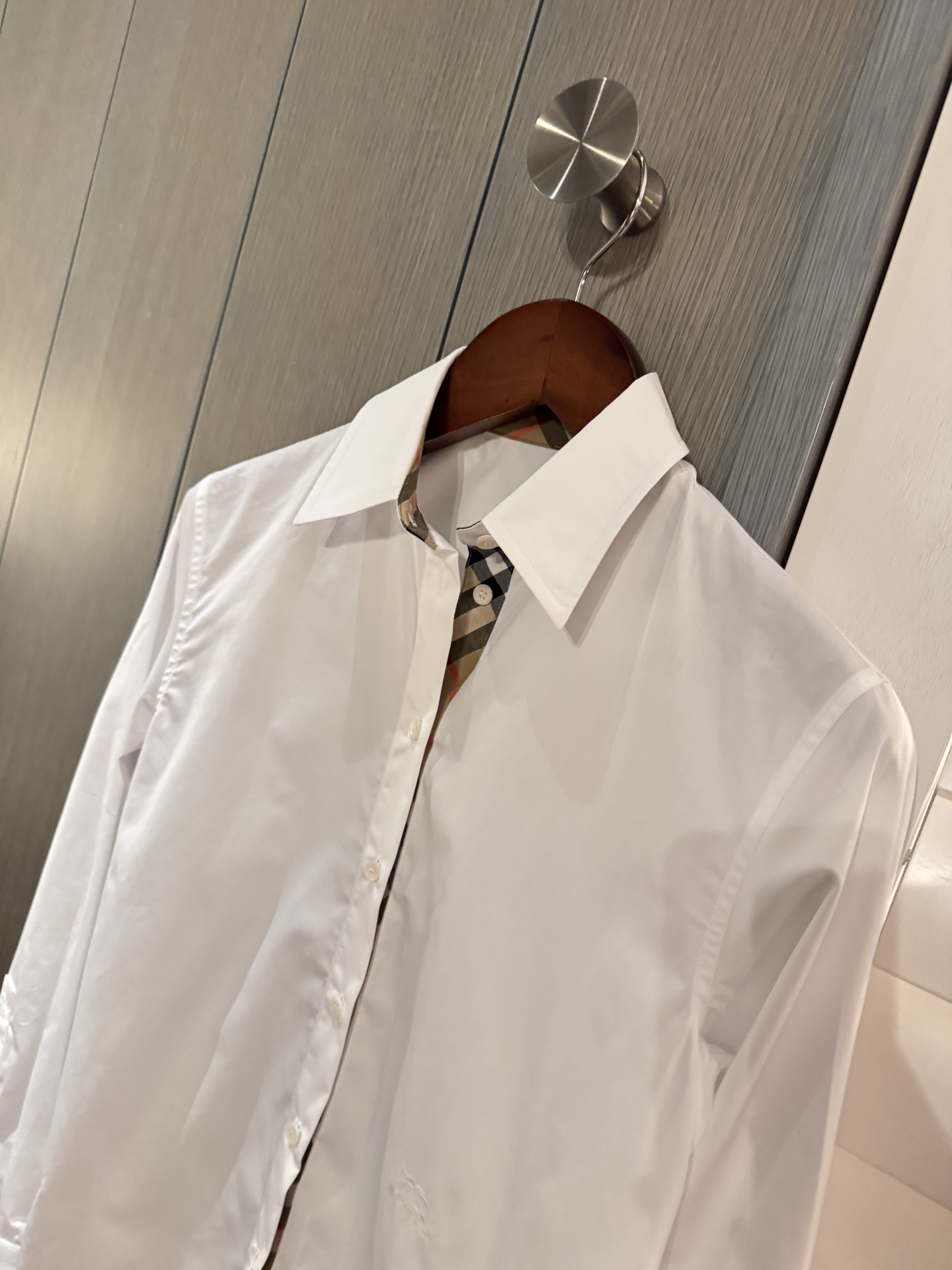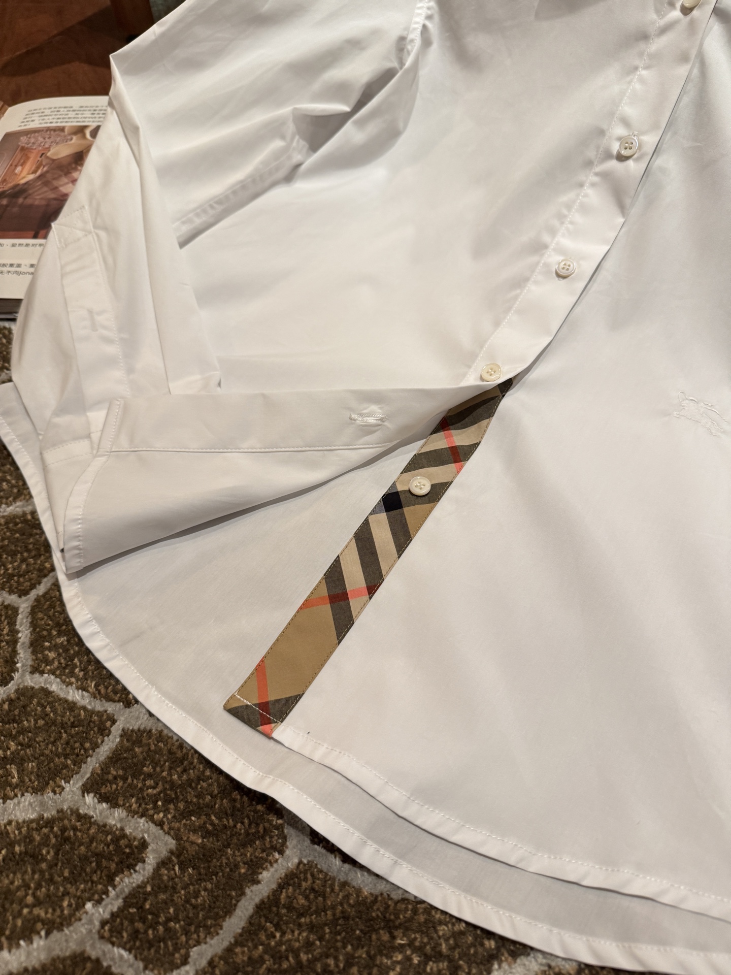 領口與袖口特別加入格紋拼接細節,低調卻是整件襯衫的靈魂設計,讓整體造型更有層次與亮點。