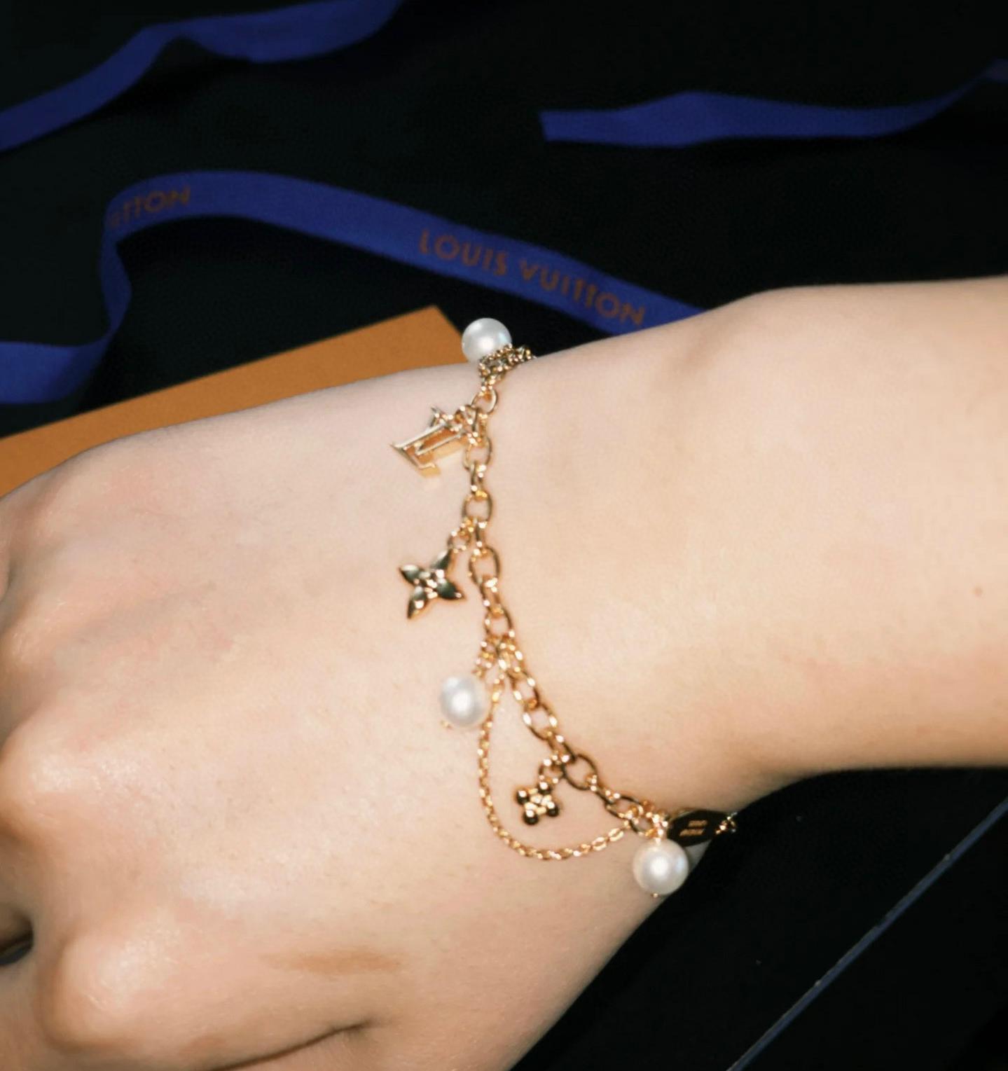 這條手鍊以珍珠搭配金花流蘇吊墜,細膩又富有動感,舉手投足間都有輕盈靈動的光澤。